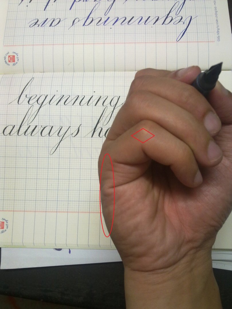 Xuất phát từ ý muốn học chữ đẹp Latinh sau khi em đã đạt được trình độ viết chữ Hán ở mức độ bản thân cho phép, em đã muốn đi học lại chữ Latinh. Đầu tiên em mua vở do các cháu học sinh không dùng nữa ở hàng sách cũ ( gần WC trường Việt Đức, đoạn giao Lý Thường Kiệt - Quang Trung ), vở dạy chữ đẹp về tập theo mẫu chữ ABC theo giáo trình của tiểu học. Trong vòng 1 năm em không thể tiến bộ, chắc cũng do em không yêu hoặc hợp với chữ này. Em bắt đầu tìm kiếm 1 lớp học chính quy - có thầy dạy - như tìm thấy địa chỉ với từ khóa lớp dạy chữ đẹp, hoặc tìm những bài báo hay những tựa đề về chữ đẹp hoặc tìm giáo trình của Việt Nam để xem. Sau khi đọc 1 số bài báo, cũng như nhìn hình minh họa trên đó, em quyết định không đăng ký đi học mà tự học. Cũng là cơ duyên mà em vô tình tìm được trang này trên google, vào đến đây, em đã đọc 1 lèo các bài viết Chữ viết tay của các thành viên và cực kỳ ngưỡng mộ bác Ducati, sau đó đọc thêm topic chữ đẹp của bác Inpluviam, em biết đến trang web iampeth và sự nghiệp tự học của em bắt đầu từ đó, em tải tất cả giáo trình, in ra, tự học. Vốn có nền tảng cầm bút và kỹ năng về mực, bút của thư pháp Hán nên chữ Latinh với em khá dễ dàng. Em tự học từ Business Cursive, Roman, Italic, Gothic, Fraktur, rồi dip-pen. Và tự học tự tìm tài liệu, đang học Cursive thì em tìm tài liệu Roman, tập tới Roman em tìm tài liệu Italic và cứ thế, vừa xem tài liệu bằng cách tìm kiếm trên google và youtube, vừa tập. Và vừa rồi có 1 bác nhờ em sửa tay cầm bút cho con bác ý, em toàn nhìn hình bắt bệnh như sau