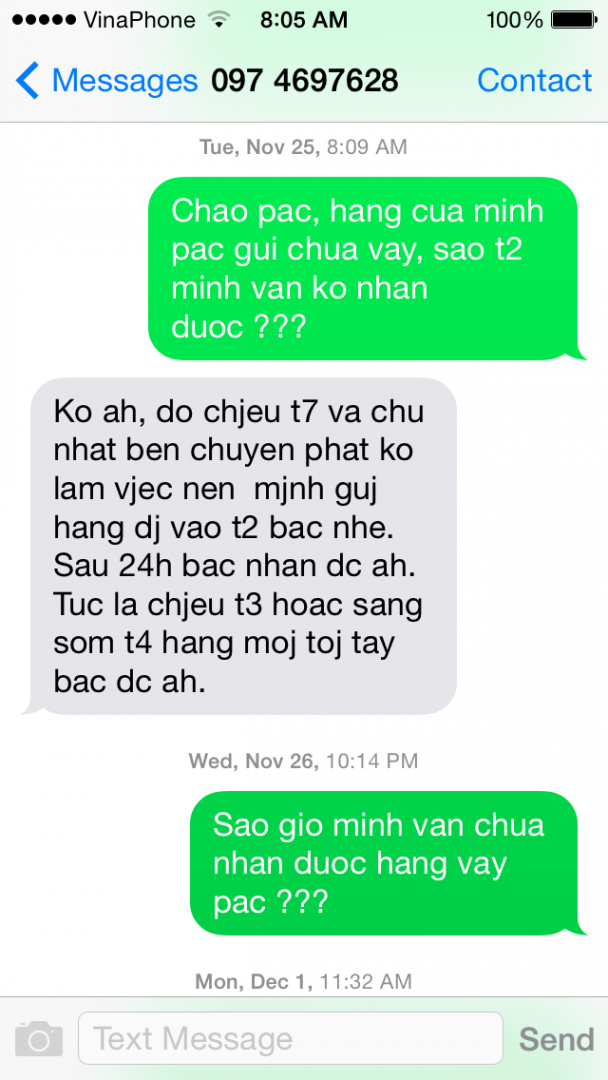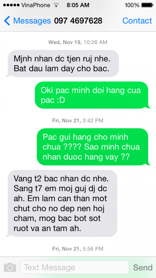 Mình có liên hệ ngay khi có thể, và như mình nói thì bác bán nói hàng nhiều nhưng đã làm xong rồi, và chiều nay sẽ gửi hàng"Bác bán có liên hệ hay thông tin gì với bác không?