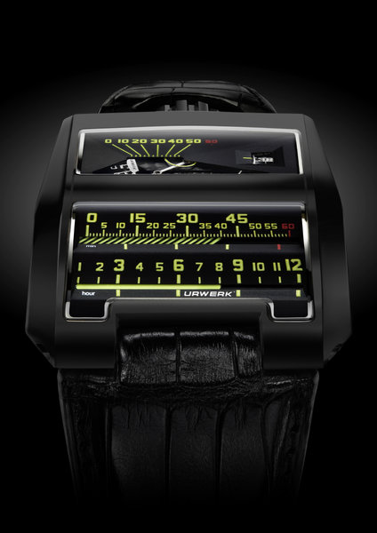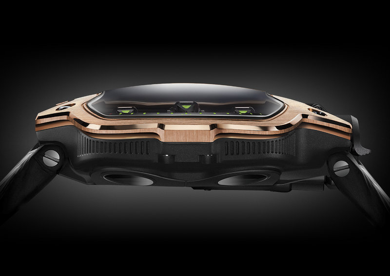 Model HM 3 Frog với những con số được in lớn để giúp quan sát dễ dàng hơn, và thay cho kim đồng hồ chuyển động quanh một trục cố định là hai khối hình bán cầu tự chuyển động xoay.