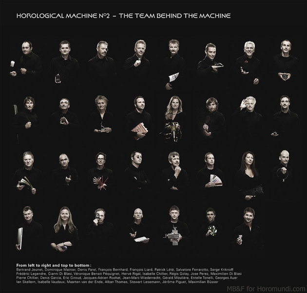 Mỗi chiếc đồng hồ của MB & F đều do một đội ngũ “Friend” (những người bạn) tạo ra. Mỗi người trong số đó đều có tài năng riêng, và bằng cách tối ưu hoá thế mạnh của mỗi người, cảm hứng và sang tạo luôn ở mức tối đa. Cũng bởi lý do đó, mỗi chiếc đồng hồ MB & F đều ngợi ca tên tuổi của mỗi cá nhân, không có ai bị bỏ quên cả.