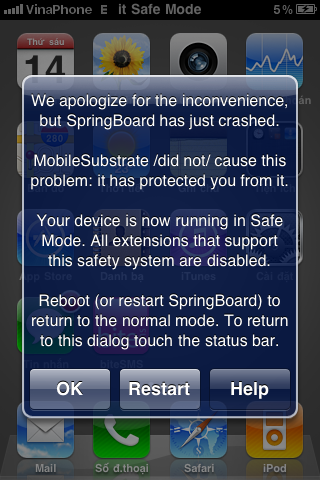 E là thành viên mới vừa sở hữu được cái IP 3G 8GB. Thấy trên mạng đã có FW 4.2.1 nên e mạo mụi up lên FW 4.2.1 thấy chạy cũng ổn. Nhưng sao mấy bữa nay e cài thêm 1 vài cái game mới (cài bằng PC Suite IP) thì máy hay bị chuyển về chế độ safe mode vào báo phải restart lai SpingBoard mới được (có hình kèm theo). Bác nào biết cách khắc phục chỉ e với thank nhiều lắm