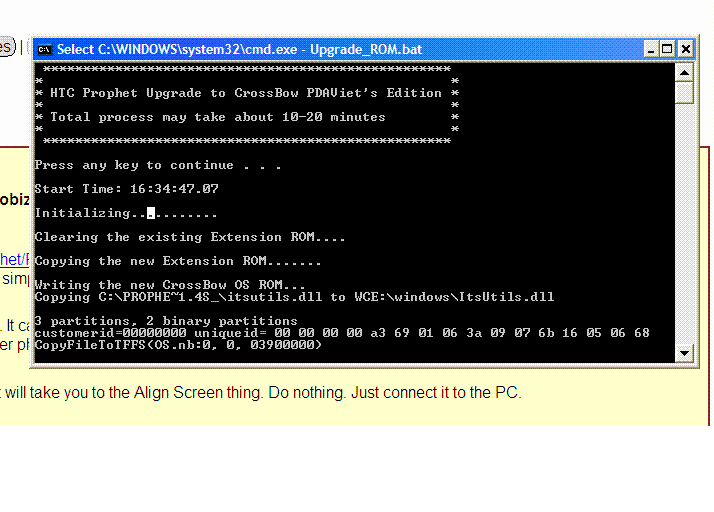 Bước 2 : Ngay sau khi up bước 1 & thực hiện xong các thao tác copy & paste, chỉnh múi giờ, Align Screen.... vào màn hình Today của PPC, bác Sync PPC với PC ở chế độ Guess, chạy file Upgrade_ROM.bat ( Trong thư mục Rom Prophet_4.0.0.0.4S_PV ) & chờ cho đến khi màn DOS trên PC báo Congratulation...... bác rút cáp ra và hard reset PPC ( Camera+Commanager+Soft reset ) >>>>>>>>>>>>> ok