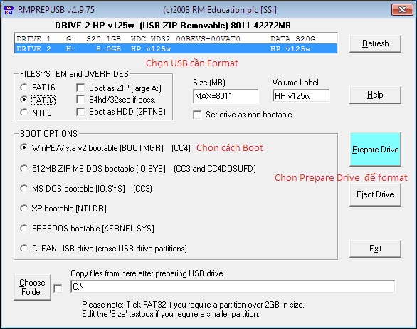 - Nếu muốn Format lại USB thì cũng có công cụ đi kèm theo đó là RMPrepUSB để xóa sạch USB trước khi tạo. Như hình sau :