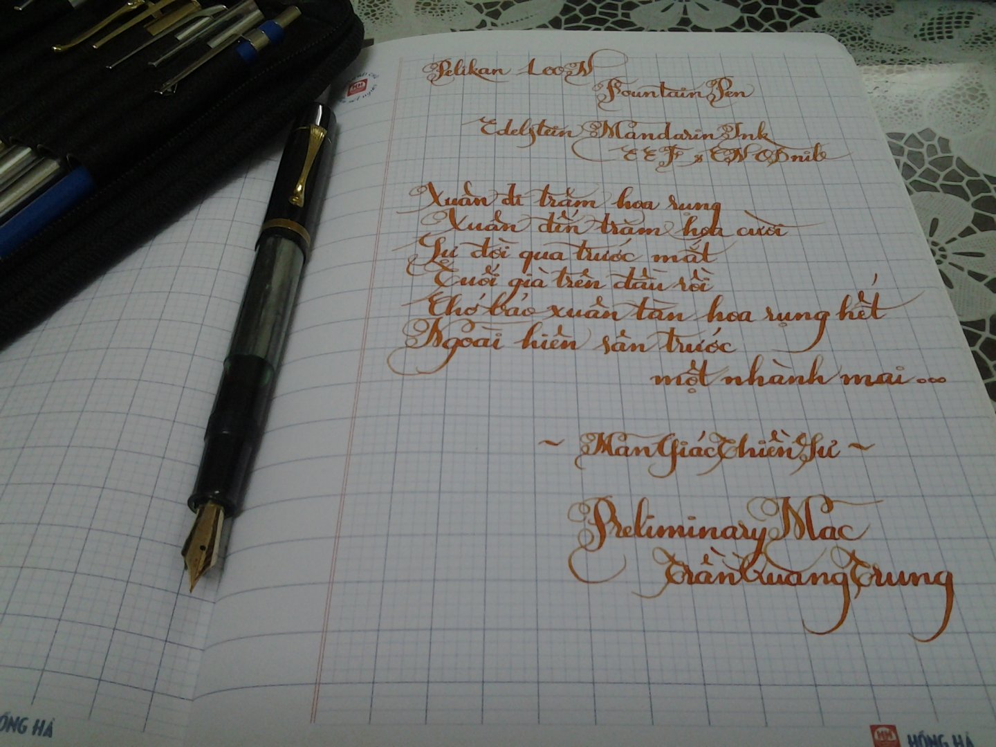 Cây Pelikan 400 của bác @gianker cũng flex thế nhỉ, hay là thay ngòi từ cây 100N sang thế bác D:Em cũng đang dùng mực R&K màu Salix này, viết hàng ngày được 3, 4 tháng nay rồi. Thấy ko có vấn đề gì. Trước hay dùng bút Platium 5000 ngòi F với mực Aurora Blue thì bỏ ra ngoài vài phút là bị khô mực ở đầu ngòi, lại phải ấn ấn thì mới ra mực. Nhưng dùng bút Pelikan 400 ngòi M với mực R&K Salix thì nhiều khi quên, để nửa tiếng ko đóng nắp, mà đầu ngòi vẫn ướt, viết nhoay nhoáy, hầu như chưa gặp trường hợp bị khô.