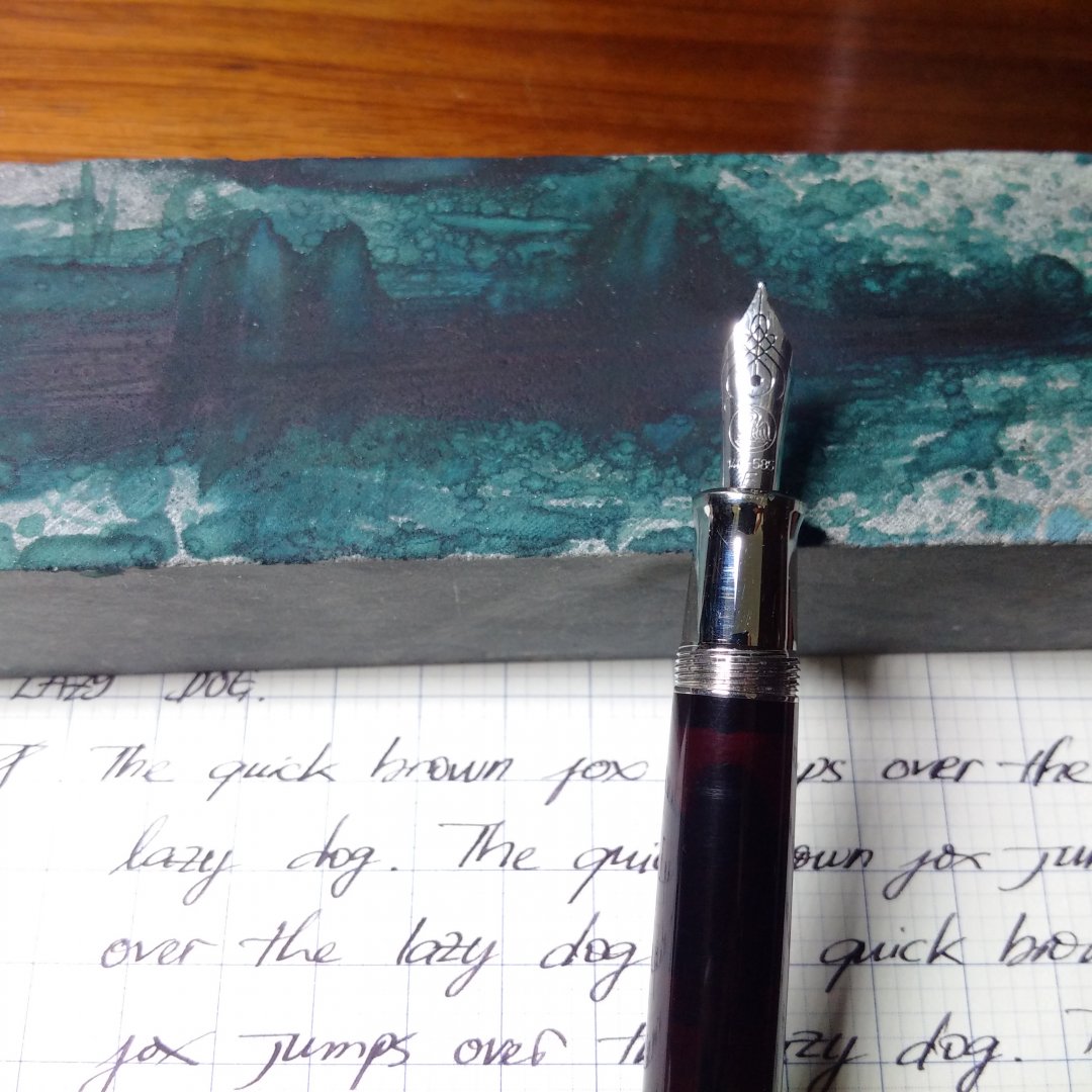 Bút cũ, dùng hàng ngày của em nhưng được mài thành ngòi cursive italic. Nét chữ đẹp và có hồn hơn nét tròn thông thường (cảm nhận cá nhân). Em mất 3h mới mài xong cái ngòi. Viên bi (tipping material) cả Pelikan rất cứng, chắc toàn iridium chứ ít pha tạp chất như ngòi rẻ tiền, nên mài lâu.