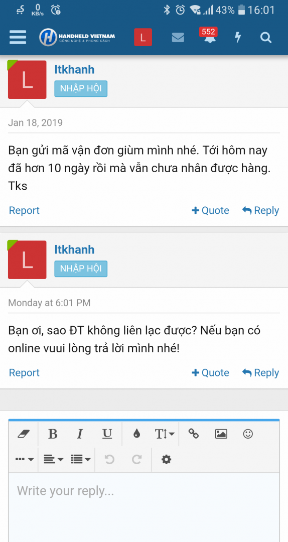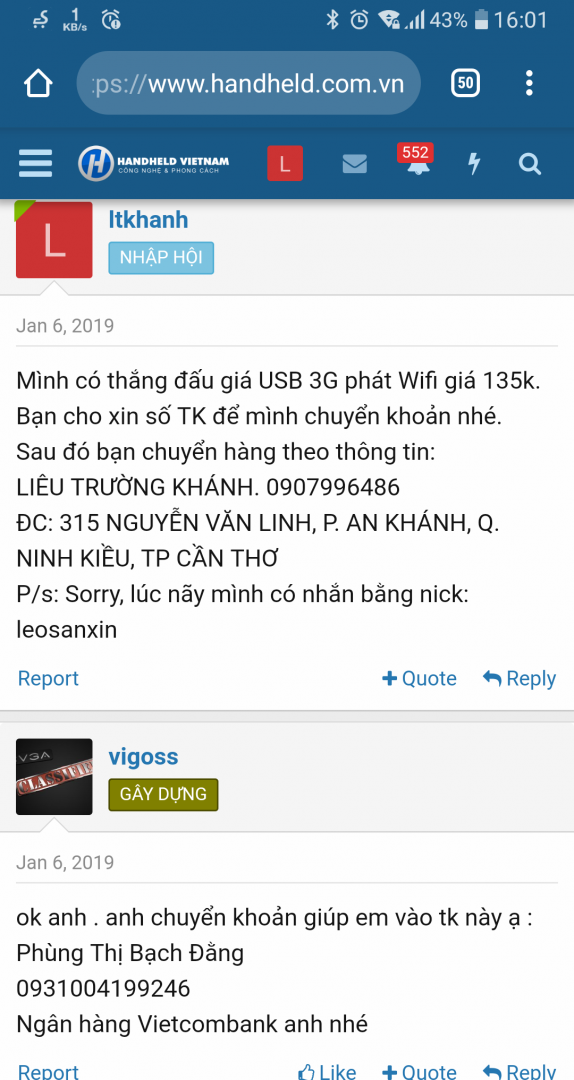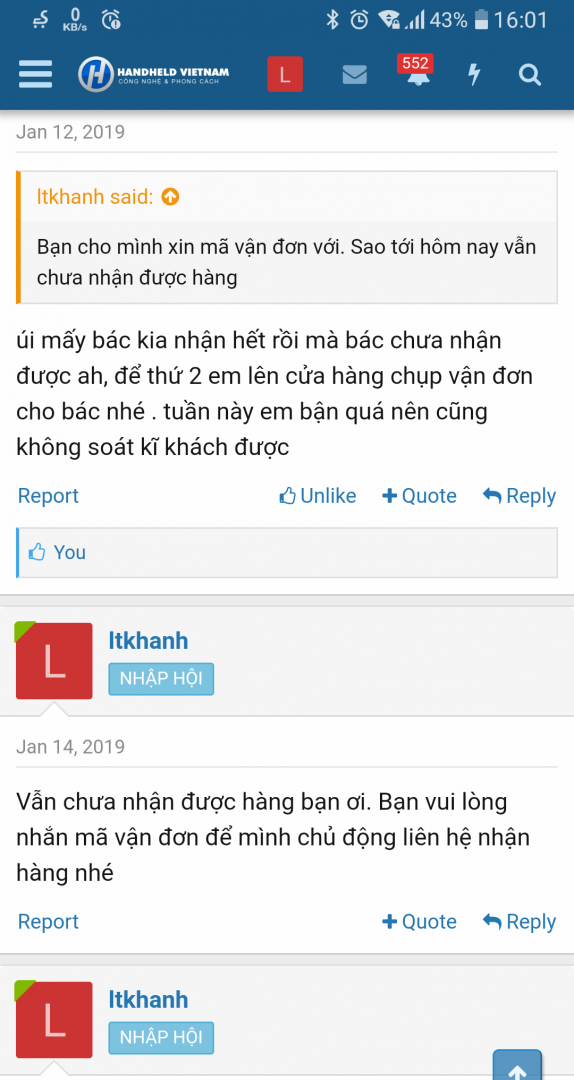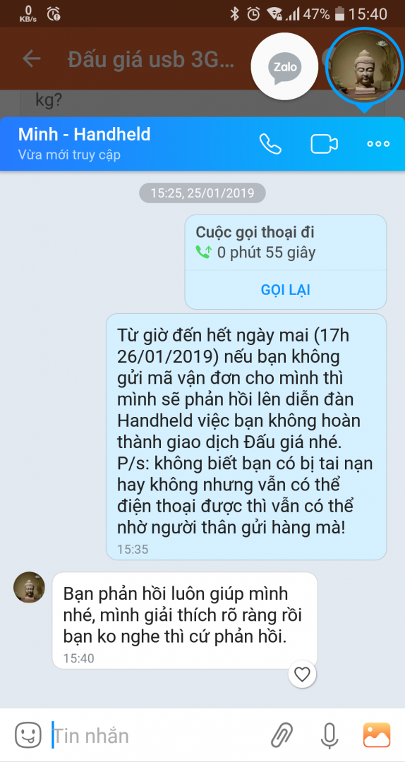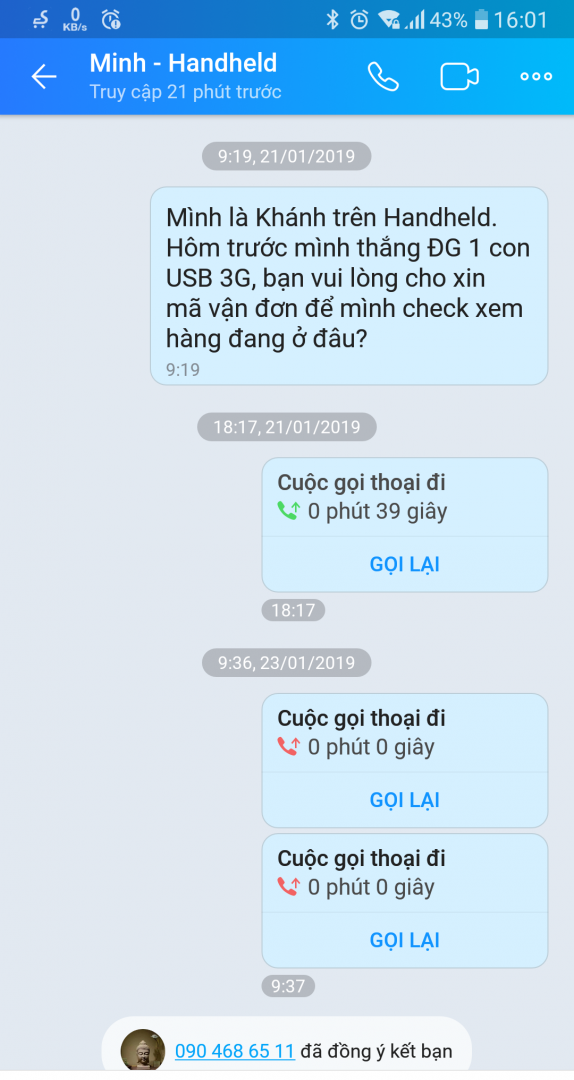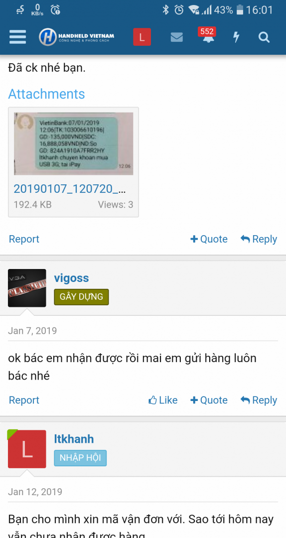 Sau khi liên lạc đã chuyển tiền cho bác chủ Minh @vigoss vào 07/01/2019 và bạn Minh hứa sẽ chuyển hàng cho mình. Giá trị món hàng không cao nên mình tin tưởng và đợi nhận hàng. Sau 1 tuần mình không nhận đc hàng nên có liên lạc lại thì bạn Minh nói là đã chuyển hàng rồi và hứa sẽ kiểm tra lại nhưng không thấy trả lời. Sau đó mình điện thoại rất nhiều lần đều không đc, vài ngày sau mình tìm và thấy bạn @vigoss đang online Zalo nên đt thì bạn Minh bảo đang bị tai nạn phải nằm viện và hứa sau 1, 2 ngày sẽ kiểm tra lại. Mình đã nhiều lần điện thoại xem đã gửi hàng chưa và cho xin Mã vận đơn nhưng lần nào bạn Minh cũng hứa hẹn là đã nhờ đứa em gửi hàng rồi sẽ kiểm lại rồi báo sau. Mình có yêu cầu chụp Mã Vận đơn cho xem nhiều lần nhưng vẫn không đc, và sau cùng thì bạn ấy Yêu Cầu mình cứ Phản hồi lại với diễn đàn đi.