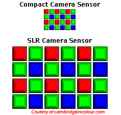 Kích thước sensor là cực kỳ quan trọng, sensor càng lớn thì ảnh thu được càng rõ đẹp vì chất lượng các cảm biến màu sắc được gắn trên sensor tốt hơn nhiều (giả sử cùng là máy 10MP, nhét 10 triệu cái cảm biến lên 25mm2 so với 330mm2 thì dĩ nhiên cái lớn tha hồ mà áp dụng công nghệ kỹ thuật)
