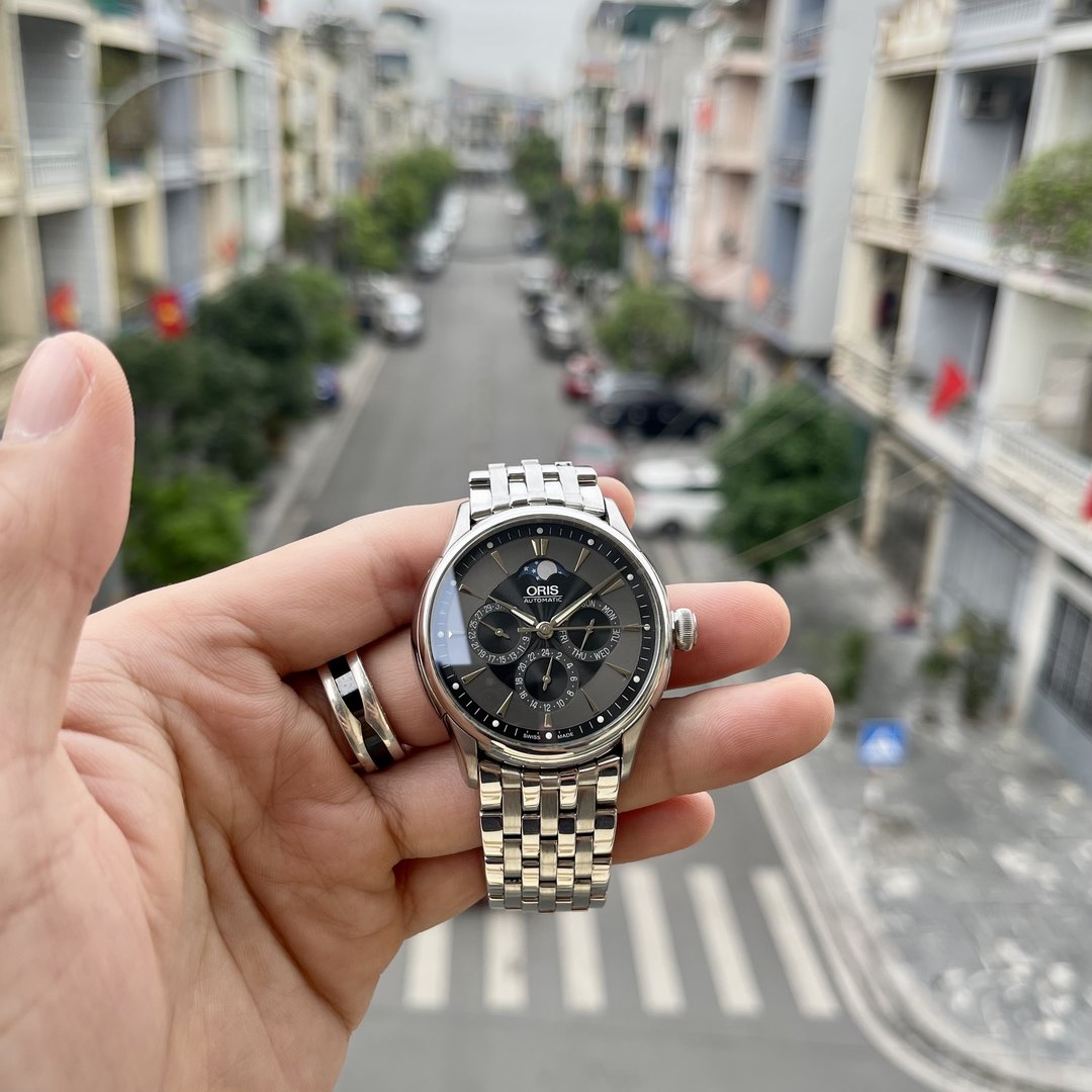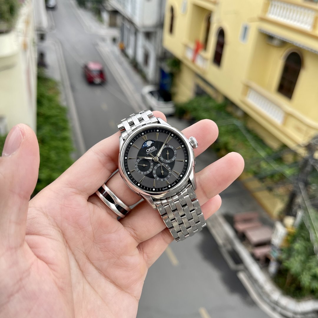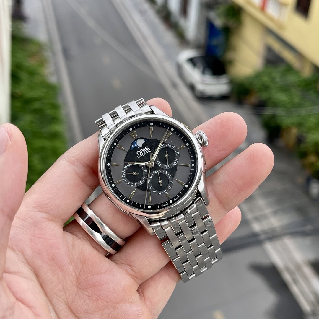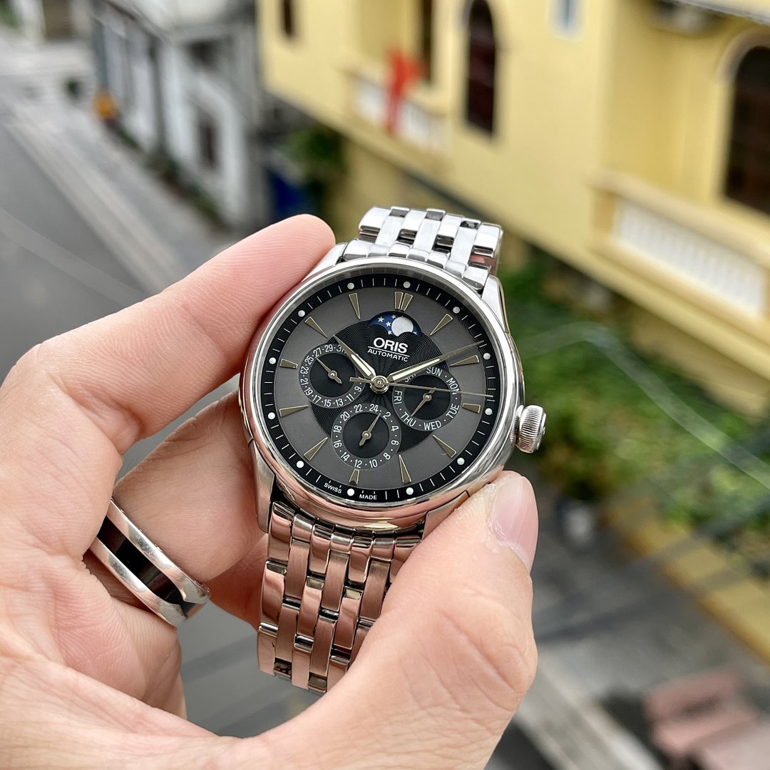 Size 40mm, kính sapphire, máy automatic Oris Calibre 581 có lịch ngày lịch thứ lịch 24h trăng sao. Đồng hồ đã qua sử dụng chỉ còn đồng hồ và hộp. Bảo hành 12 tháng.