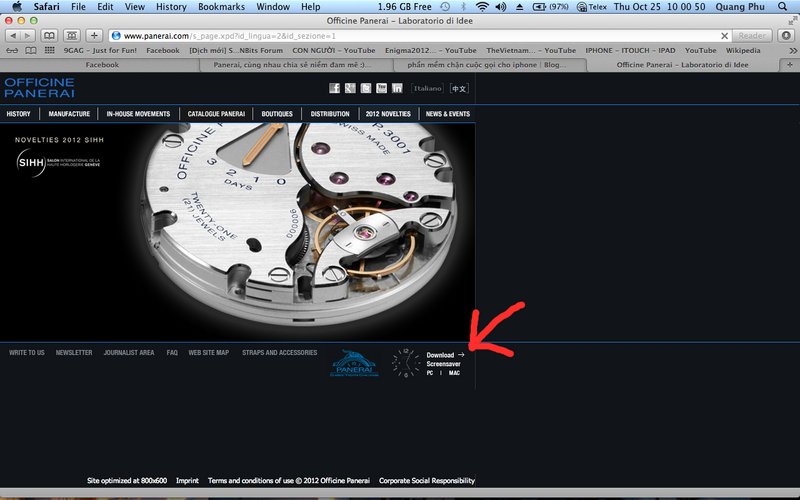 Anh Trai có bản Win không cho e phát. em vào ko tìm thấy luôn, chắc tại giao diện thay đổi rồibác cứ vào trang www.panerai.com, tìm chỗ download screensaver nó sẽ có bản cho mac hay win, cài vào là xong thôi) chỗ e chỉ mũi tên đỏ ý