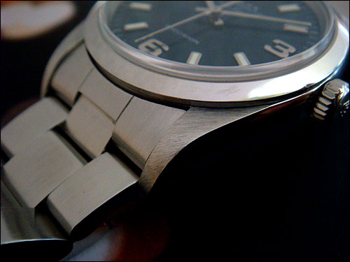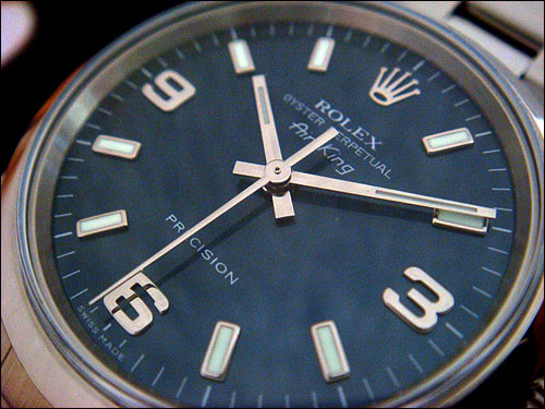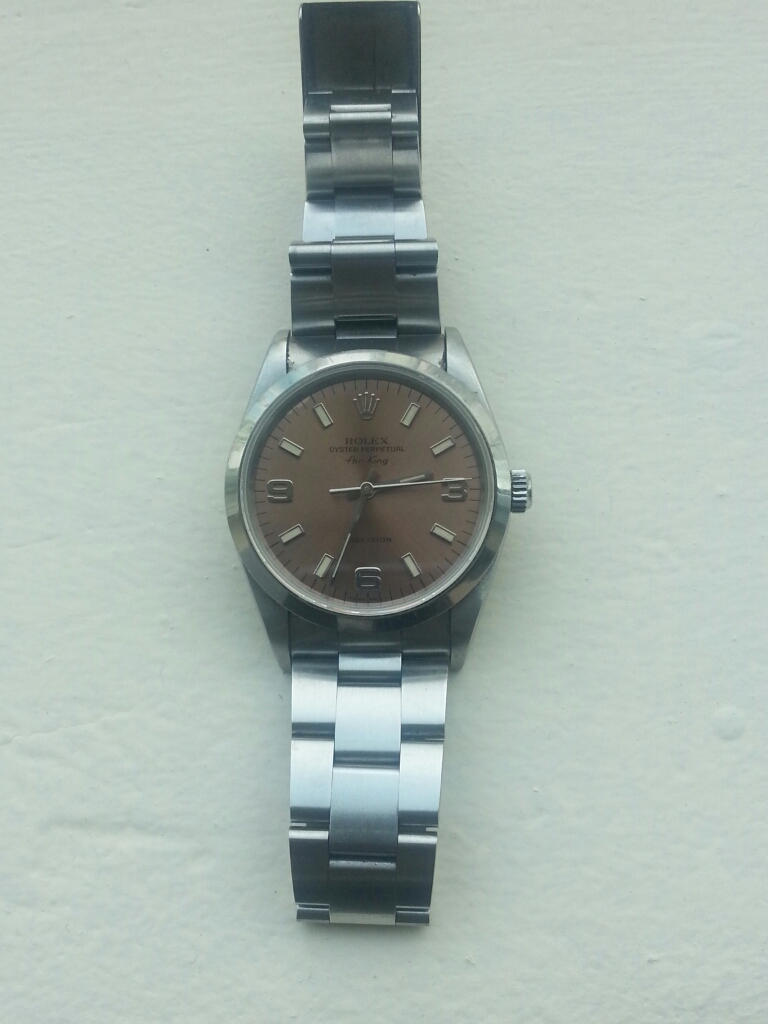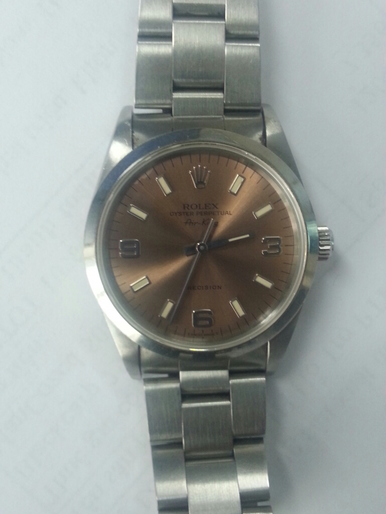 Đầu tiên là Rolex Air King đời cũ sau 2000 với Ref number là 14000, kính Sapphire với mặt không có số thanh lịch. Chiếc 14000 này xài máy Rolex Cal. 3000. Chống nước đến 100m/330 feet.