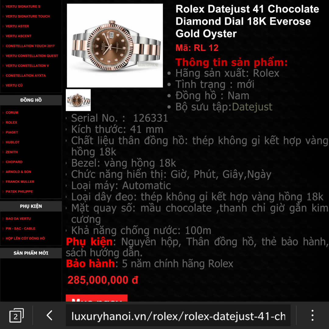Các bác thứ điều tra xem thế nào, có điều em thấy có nhưng sp như con datejustsnày của nó giá trên thì trường uk chênh nhau vơi sub 400 bảng( khoảng hơn 10tr) thi đây giá nó lại hởn280t