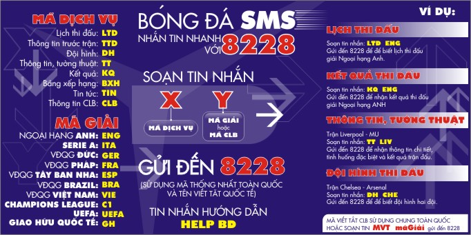 SMS - Bóng đá 8228 cung cấp tất cả các thông tin cập nhật liên tục như: (dùng cho mạng 090, 091 còn bác Viettel thì vài hôm nữa nhé