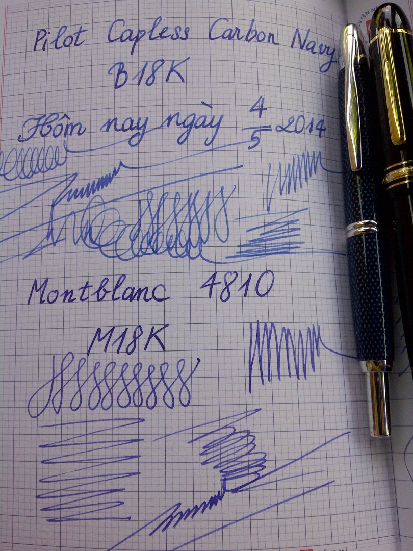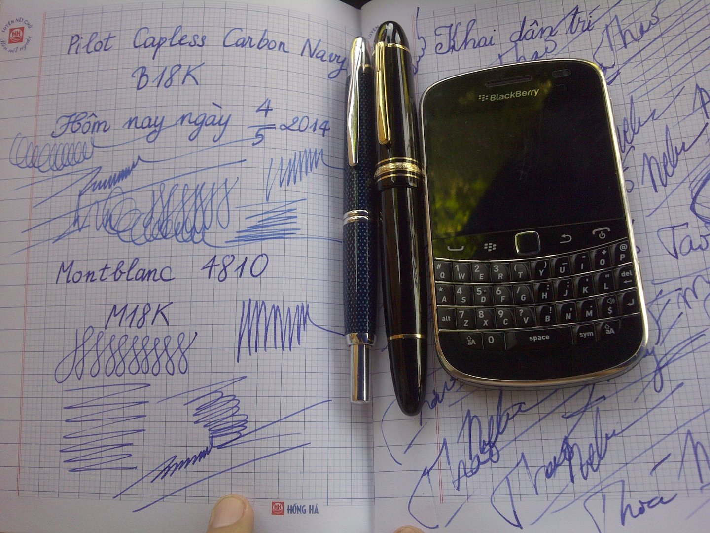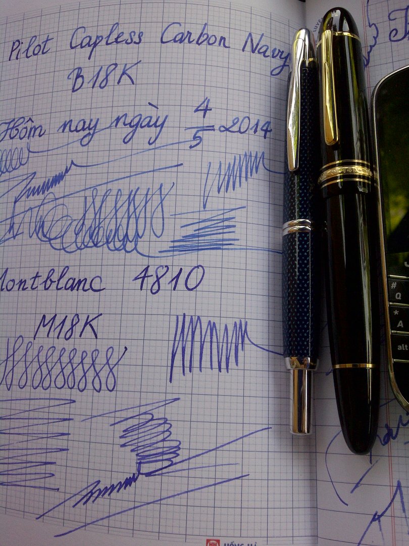 Sau cả tuần lễ viết đủ mọi thứ, lúc thì cây MB lúc thì cây Sailor và Lamy 2000 để so sánh xem sự khác nhau và cảm nhận về ngòi thì em nhận thấy ngòi của MB viết êm và trơn hơn so với cây Sailor Kaba-Zaiku, nét bút thì ngòi F Montblanc bằng (nét có phần hơi nhỉnh hơn) so với ngòi M của Sailor, khi viết không có cảm giác gai gai, sần sật, (viết trên giấy vở Hồng Hà) (Lúc chưa có cây MB thì em thấy ngòi Sailor viết đã thích lắm rồi, nó cũng êm, cũng mềm mại nhưng khi viết ngòi của MB thì thật sự cảm giác khác hẳn, tuy nhiên mỗi ngòi đều có ưu nhược điểm khác nhau) còn so với Lamy 2000 thì em thấy khoảng 8/10 – ký với bút MB thì mực ra đều và nét không bị mất khi ký nhanh (Cái này hơi buồn chút xíu vì giá MB chát quá so với cây 2000 – Nhưng thôi an ủi – Giá trị cộng thêm về thương hiệu hi hi hi và người ta cũng nói rồi – hơn nhau ½ điểm là khoảng cách tương đương với cả một đại dương).