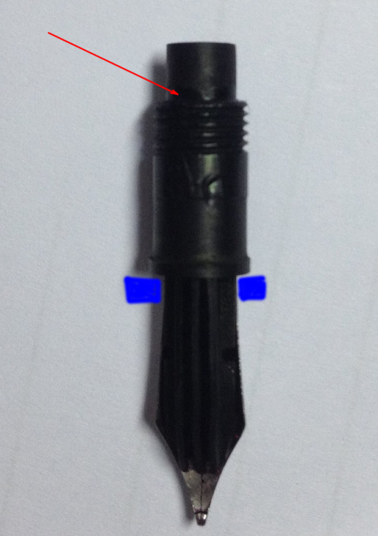 Còn điểm nữa là không được dùng kìm kẹp lại đâu bác ạ, kể cả có lót, mà là kê ở điểm đánh dấu màu xanh như trên hình rồi gõ cho ngòi và feed đẩy ra, kẹp kìm thì cũng như đang giữ chặt thêm ngòi và feed lại rồi, khó đẩy ra.