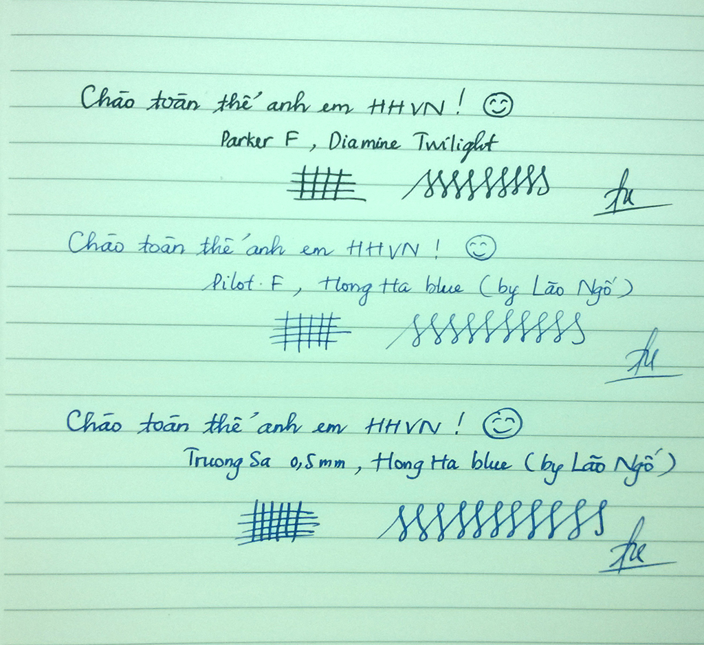 1. Bút Trường Sa: ngòi nét tương đương Vector F của Parker, viết khá trơn tuy có 1 số góc nghiêng còn hơi gai, mực ra đều đậm, kýnhanh không mất nét. Cảm giác viết từ lần đầu cũng rất thích, tuy nhiên bút nhẹ nên chưa quen do em toàn dùng bút vỏ sắt.