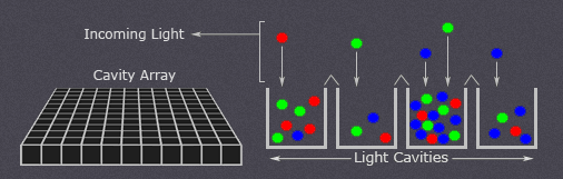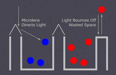 Có thể bạn sẽ thắc mắc tại biểu đồ đầu tiên không đặt mỗi khoang gần nhau. Cảm biến máy ảnh trên thực tế không có thể che toàn bộ bề mặt của cảm biến. Thực tế, chúng chỉ che một nửa toàn bộ khu vực, còn lại để kết nối với các đồ điện tử khác. Mỗi khoang với chóp nhọn nhỏ giữa chúng để hướng photon vào khoang này hay khoang khác. Máy ảnh số dùng thêm “vi thấu kính” trên mỗi chóp để tăng cường khả năng tập trung ánh sáng. Những thấu kính này như một cái phễu hướng photon vào khoang tương ứng để tăng cường hoặc sẽ không được dùng đến trong khoang đó.