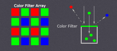 Mỗi khoang không thể phân biệt được có bao nhiêu màu rơi vào nên hình minh họa ở trên chỉ có thể tạo ra hình ảnh grayscale. Để chụp ảnh màu, mỗi khoang phải có bộ lọc phía trên, bộ lọc này chỉ cho phép một màu ánh sáng nhất định đi vào. Tất cả máy ảnh số hiện nay chỉ có thể giữ một trong số ba màu chính (R-G-B) ở mỗi khoang và loại bỏ 2/3 lượng ánh sáng đi vào. Vì vậy, máy ảnh phải tính toán hai màu chính còn lại để có thông tin về tất cả ba màu tại mỗi điểm ảnh. Loại lưới lọc màu phổ biến nhất có tên là “lưới lọc Bayer” như hình dưới đây.