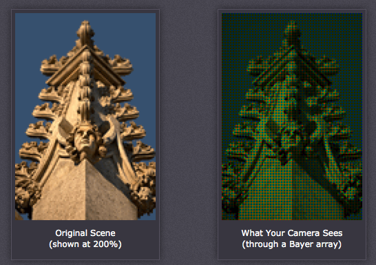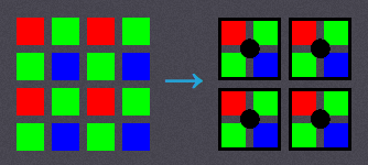 Demosaicing là quá trình chuyển lưới màu Bayer thành hình ảnh cuối cùng, gồm thông tin đầy đủ về tất cả các màu ở mỗi điểm ảnh. Làm thế nào có thể thực hiện được nếu máy ảnh không thể đo trực tiếp đầy đủ các màu? Có một cách để nhận diện đó là xem một ô 2x2 gồm màu Red, Green và Blue là một khoang màu đầy đủ.