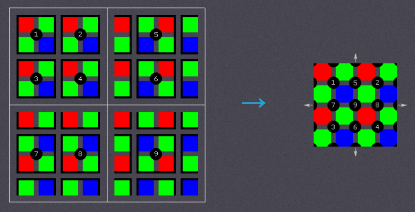Cách này cũng là một cách hay tuy nhiên hầu hết máy ảnh đều thực hiện thêm các bước để thu được thêm thông tin hình ảnh từ lưới lọc màu này. Nếu máy ảnh nhận diện màu theo ô 2x2 thì chỉ có thể đạt được độ phân giải bằng một nửa ở cả chiều dọc và ngang. Nói cách khác, nếu một máy ảnh xử lý màu sử dụng nhiều ô 2x2 chồng lên nhau thì độ phân giải sẽ cao hơn so với khi sử dụng các ô 2x2 đơn lẻ. Sự kết hợp các ô 2x2 chồng nhau dưới đây có thể giúp thu được nhiều thông tin hình ảnh hơn.