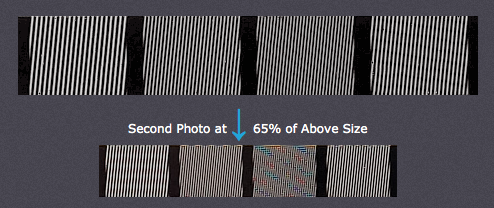 Hai ảnh ở trên có độ phóng đại khác nhau. Lưu ý hình ảnh của moire ở bốn ô vuông phía dưới và ô vuông thứ ba của ảnh đầu tiên. Có thể thấy lỗi xảy ra ở ô vuông thứ ba của ảnh dưới. Những trường hợp lỗi ảnh này phụ thuộc vào cả loại khuôn mẫu và phần mềm được sử dụng để xử lý file RAW của máy ảnh số.