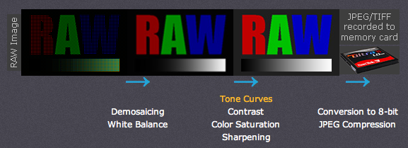 File RAW được dùng để xử lý ra ảnh JPEG hoặc TIFF cuối cùng thông qua một số bước, mỗi bước trong đó có thể có một vài điều chỉnh hình ảnh mà không thể đảo ngược. Một lợi thế của file RAW đó là cho phép người chụp tạm hoãn những điều chỉnh đó để xử lý sau này theo ý của người chụp. Sơ đồ sau đây minh hoạ cho trình tự điều chính: