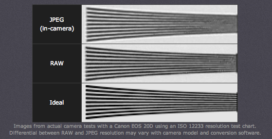 Ảnh JPEG do máy ảnh xử lý ra không thể xử lý tốt khi khoảng cách giữa các dòng ngắn hơn như trong file RAW. Hơn nữa, một file RAW không thể đạt được đến mức lý tưởng bởi vì quá trình xử lý demosaicing luôn luôn làm mềm ảnh. Chỉ có cảm biến ghi nhận được cả 3 màu tại mỗi điểm có thể đạt được ảnh lý tưởng như ở hình cuối cùng (cảm biến kiểu Foveon).