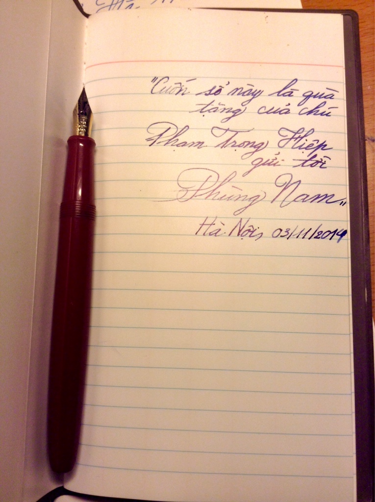Em nhận quà của chú Hiệp hôm thứ 2 nên dùng mực HH xanh đen chép vội vài dòng vào để lưu kỉ niệm chứ chưa kịp bơm mực mới vào viết :D