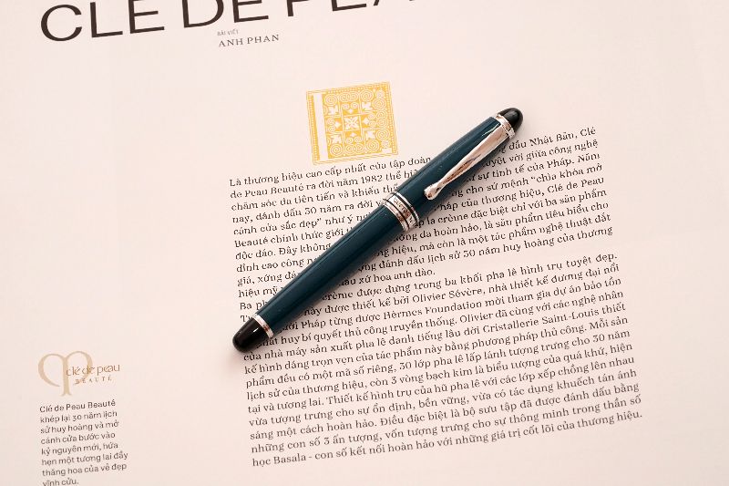Montblanc, cơ chế đệm bên trong nắp tạo cảm giác êm tay khi đậy. Thanh cài bằng hợp kim mạ bạc, thiết kế góc cạnh khá nam tính, tạo cảm giác chắc chắn khi cài lên áo. Đỉnh nắp và đuôi bút có đính logo hoa tuyết nhỏ màu trắng. Ngòi bút bằng vàng 14K nét EF (+ Flex), lưng ngòi có khắc ký hiệu 585. Bút bơm mực bằng cơ chế piston filler, vặn đuôi bút để bơm mực, phần thân bút tích hợp làm nơi chứa mực, bút trữ được khá nhiều mực cho một lần bơm. Bút là hàng đã qua sử dụng, tổng thể ở tình trạng 95% so với tuổi đời (không kèm hộp) và đang hoạt động tốt. Giá giao lưu 3.500.000 VND.