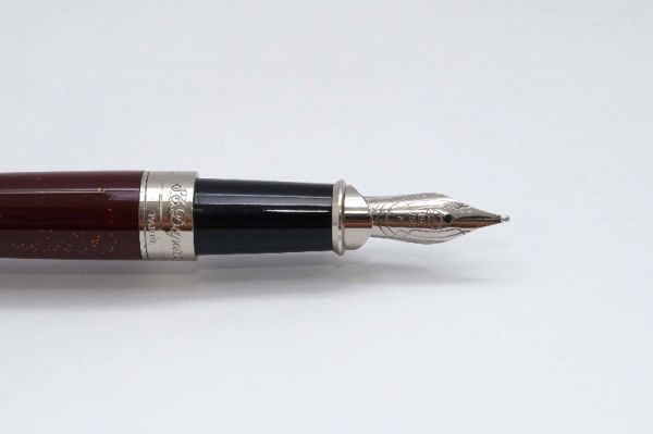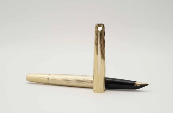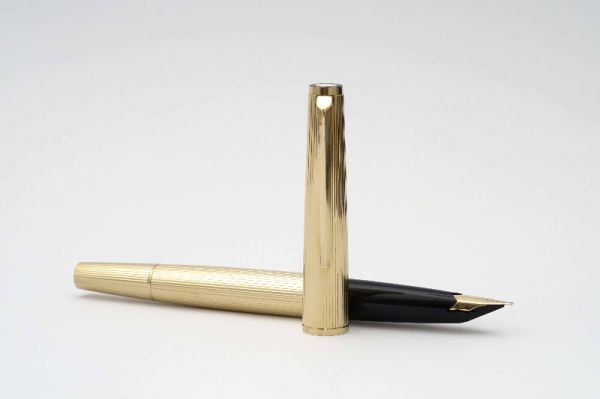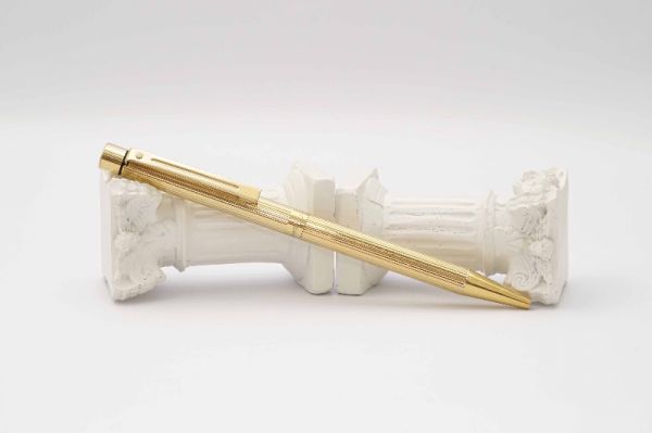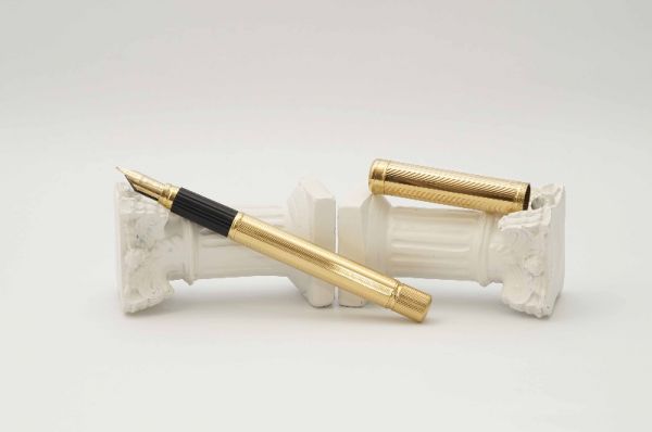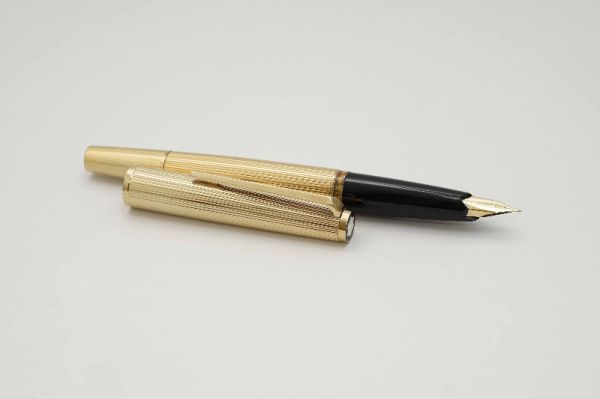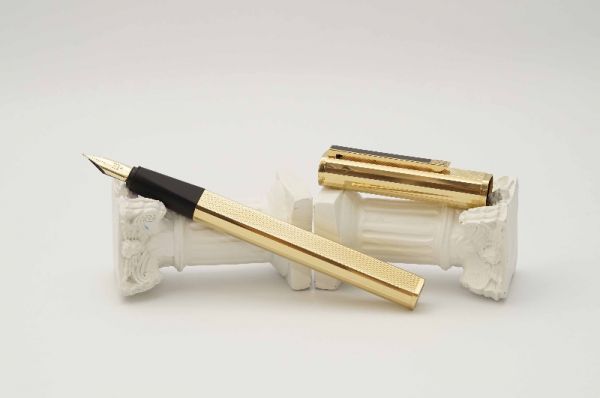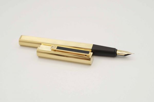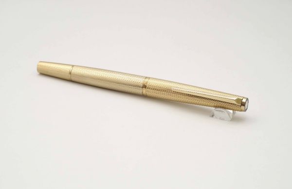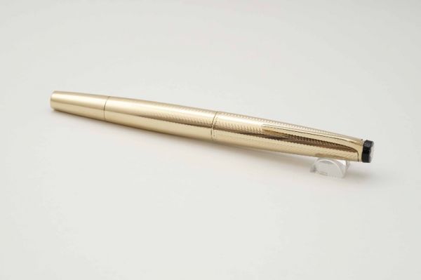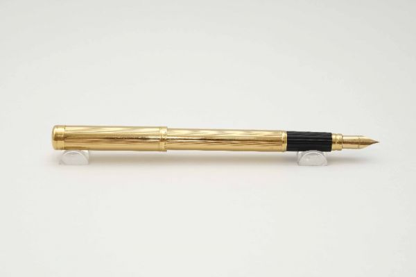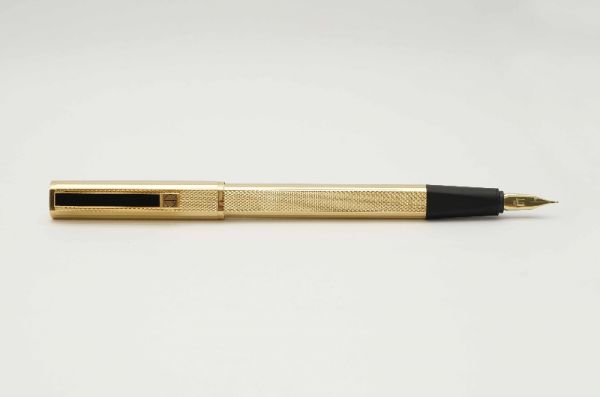 Bút máy Alfred Dunhill Gemline Classic Gold Plated thuộc series “Gemline”, là một trong những model tiêu biểu đại diện cho nghệ thuật chế tác bút cao cấp của nước Đức. Alfred Dunhill Gemline Classic Gold Plated mang đến sự khác biệt và tinh tế, đây là model phá vỡ mọi chuẩn mực thông thường với tiết diện hình chữ nhật bo tròn 2 cạnh bên hông dạng “truncated circle (stadium)” thay vì dáng trụ tròn truyền thống. Thân và nắp gia công từ hợp kim cao cấp mạ vàng 18K, bề mặt vỏ bút hoàn thiện bởi các hoa văn barleycorn rất đẹp. Nắp bút đậy êm tay, viền nắp có khắc chữ “Dunhill Germany”. Thanh cài bằng hợp kim mạ vàng, lưng cài phủ lớp men màu đen bóng, đuôi cài có đóng chìm logo Dunhill cách điệu. Thân bút có chiều dài hợp lý tạo cảm giác thoải mái khi cầm trong tay. Cụm ngòi và thân bút được liên kết bởi cơ cấu khớp vặn độc đáo thay vì sử dụng kiểu ren vặn truyền thống. Ngòi bút gia công từ vàng 18K được sản xuất bởi hãng Montblanc, kiểu dáng ngòi tương tự như dòng Montblanc Noblesse, lưng ngòi có đóng logo Dunhill và ký hiệu 750, ngòi bút cỡ f cho ra nét chữ êm và trơn mượt khi viết. Bút bơm mực bằng converter đi kèm. Tổng thể bút là hàng NOS (New Old Stock), bút không kèm hộp và đang hoạt động tốt.