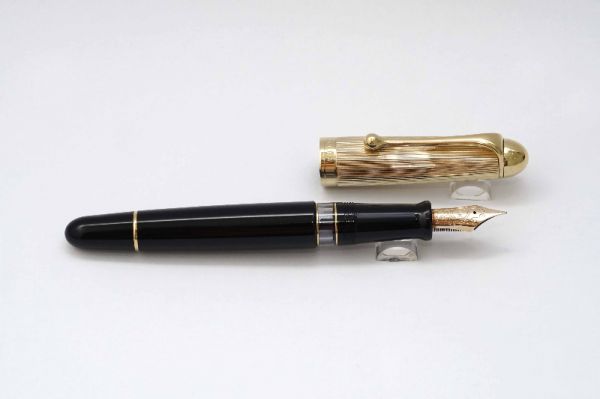 Bút máy Aurora 88 Gold Plated Cap không chỉ đạt độ hoàn thiện cao về mặt thẩm mỹ mà còn phát huy tối đa công năng sử dụng, bút có kích thước fullsize và mang kiểu dáng điếu xì g.à kinh điển. Điểm nhấn nổi bật là phần nắp bằng hợp kim bọc vàng khá dày, trang trí bằng các đường line kẻ sọc mô phỏng hiệu ứng millerighe và tạo cảm giá mịn các đầu ngón tay khi chạm vào, vòng ring nắp có khắc chữ Aurora. Cài bút gia công cứng cáp nhưng uyển chuyển, kết thúc là chấm kim loại tròn mô phỏng hình dáng giọt nước đang lơ lửng. Cửa sổ mực trong suốt nằm tiếp xúc giữa section và thân bút giúp quan sát lượng mực bên trong cũng như xem được cơ chế bơm mực. Thân bút bằng hỗn hợp nhựa cứng cao cấp màu đen bóng, có chiều dài hợp lý nên tạo cảm giác cân bằng thoải mái khi cầm. Ngòi bút là linh hồn của toàn bộ cây bút khi được gia công từ vàng 14K và được chế tác cầu kỳ với nhiều hoa văn tinh tế trên lưng ngòi, nét F của ngòi cho cảm giác êm và mượt khi đi nét trên bề mặt giấy. Bút bơm mực bằng cơ chế piston filler, đuôi bút tích hợp thành bộ phận bơm và phần thân chứa được nhiều mực cho một lần bơm. Tổng thể bút là hàng đã qua sử dụng, ở tình trạng 98%, bút không kèm hộp và đang hoạt động tốt.