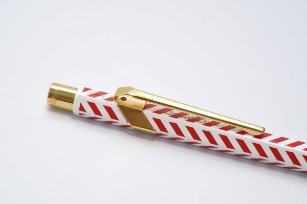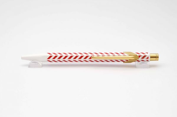 Bút bi Caran D'Ache 849 Chevron with Etui là phụ kiện không thể thiếu dành cho những ai hoạt động trong ngành kỹ thuật, kiến trúc và giới văn phòng. Bút có độ hoàn thiện cao về mặt thẩm mỹ với kiểu dáng lục giác thon gọn. Thân bút bằng hợp kim nhôm phủ lớp sơn màu trắng, xem kẽ là các hoa văn chevron màu đỏ chạy đối xứng. Bút hoạt động với cơ chế nút bấm rất êm tay, phần nút bấm mạ vàng có khắc chữ Caran D'Ache. Cài bút bằng thép mạ vàng có kiểu dáng góc cạnh tinh tế và được liên kết chắc chắn với thân bút. Dòng chữ 849 Caran D'Ache Swiss Made được in rõ nét trên thân bút. Bút đi kèm ruột bi màu đen. Bút là hàng new 100% và fullbox