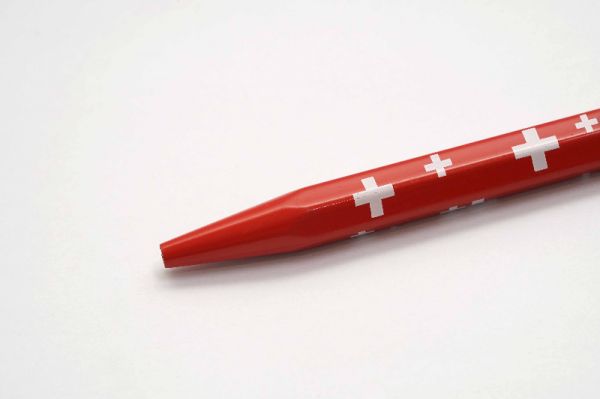 Bút bi Caran D'Ache 849 Totally Swiss là phụ kiện không thể thiếu dành cho những ai hoạt động trong ngành kỹ thuật, kiến trúc và giới văn phòng. Bút có độ hoàn thiện cao về mặt thẩm mỹ với kiểu dáng lục giác thon gọn. Thân bút bằng hợp kim nhôm phủ lớp sơn màu đỏ, xem kẽ là các hoạ tiết chữ thập màu trắng biểu tượng cho quốc kỳ Thuỵ Sĩ. Bút hoạt động với cơ chế nút bấm rất êm tay, phần nút bấm mạ chrome có khắc chữ Caran D'Ache. Cài bút bằng thép mạ chrome có kiểu dáng góc cạnh tinh tế và được liên kết chắc chắn với thân bút. Dòng chữ 849 Caran D'Ache Swiss Made được in rõ nét trên thân bút. Bút đi kèm ruột bi màu đen.