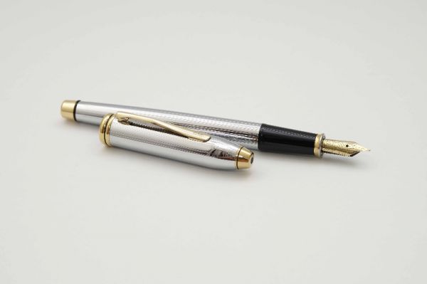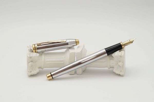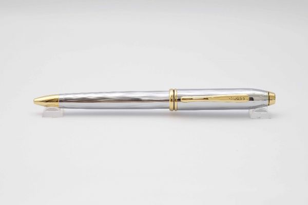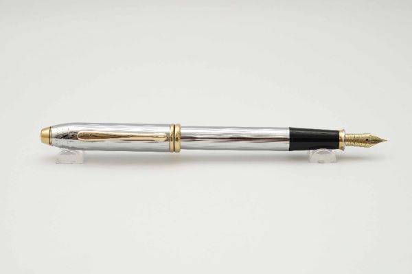 Phiên bản bút máy Cross Townsend Medalist là hiện thân của sự sang trọng, lịch lãm của thế hệ người Mỹ cổ điển và được nhiều đời tổng thống Hoa Kỳ tin dùng. Bút có kích thước mid-size, thiết kế lấy cảm hứng từ phong cách Art Deco những năm 1930 với các đường line kẻ sọc tinh tế. Thân và nắp bút bằng hợp kim đồng, vỏ ngoài được hoàn thiện với lớp mạ chrome sáng bóng. Nắp bút có kích cỡ hài hoà, đậy êm và chắc tay. Thanh cài mạ vàng 23K tạo dáng cong tinh tế, đầu cài khắc chữ Cross cách điệu. Đỉnh nắp và đuôi bút kết thúc với chóp kim loại mạ vàng, bên dưới đỉnh nắp có khắc chữ Cross USA. Ngòi bút gia công từ hợp kim bọc vàng 23K, lưng ngòi chạm khắc logo Cross cùng nhiều hoa văn tinh xảo, ngòi bút cỡ XF cho ra nét chữ mượt mà khi viết. Thân bút có chiều dài hợp lý tạo cảm giác thoải mái khi cầm. Bút bơm mực bằng converter đi kèm. Bút đi kèm hộp gift set bằng chất liệu giấy cứng cao cấp, lớp lót bên trong phủ nhung mỏng màu đen và lọ mực 62,5ml.