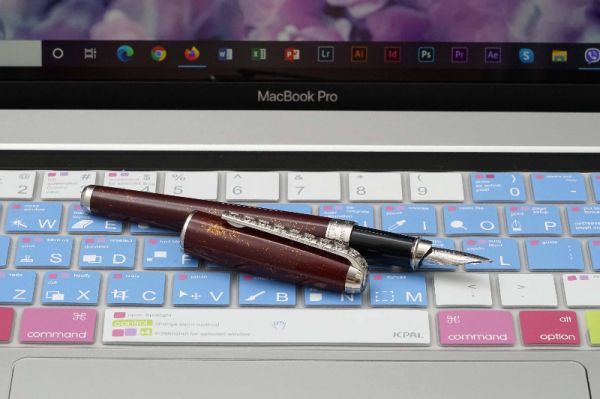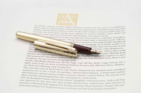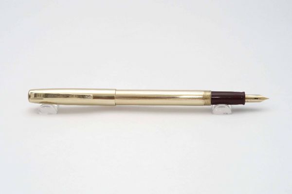 Eversharp Slim Ventura Gold Filled là phiên bản thuộc series Eversharp vintage ra mắt giai đoạn từ năm 1953-1957 tại Mỹ. Đúng như tên gọi Slim Ventur, bút có kích thước khá gọn trong lòng bàn tay nên phù hợp với mọi người dùng. Eversharp Slim Ventura Gold Filled có độ hoàn thiện cao về mặt thẩm mỹ với phần thân và nắp bút bằng chất liệu hợp kim đồng, phần vỏ ngoài được bọc lớp vàng 14K có độ dày 1/10 micron, bề mặt vỏ bút tạo điểm nhấn với các đường line kẻ sọc tinh tế. Nắp bút đậy kiểu ren vặn, phần cài bút bằng kim loại bọc vàng, lưng cài có khắc chi tiết dòng chữ Eversharp Made in USA. Thân bút có chiều dài khá cân đối tạo cảm giá thoải mái khi cầm. Cụm section gia công từ hỗn hợp nhựa cứng màu đỏ burgundy bắt mắt. Ngòi bút chế tác từ vàng 14K và tạo dáng cong rất tinh tế, đầu rãnh dẫn mực có “breath-hole” hình thoi, ngòi bút cỡ F cho ra nét chữ khá êm khi viết trên mặt giấy. Bút bơm mực bằng piston zin đi kèm với cơ chế bơm “diamatic filling unit” gần giống với kiểu bơm aerometric của dòng Parker 51.