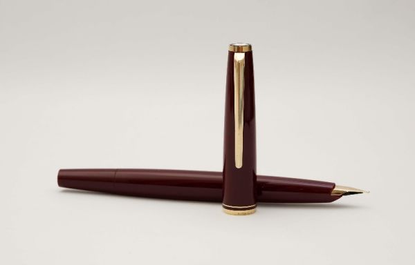 Thuộc series Meisterstuck 144 sản xuất tại Đức từ năm 1990 – 1999, bút máy Montblanc Meisterstuck 144R Bordeaux có hình dáng điếu xì gà kinh điển với kích thước tiêu chuẩn nên cầm rất vừa tay khi sử dụng. Thân và nắp bút được gia công từ hỗn hợp nhựa resin cao cấp màu đỏ Bordeaux độc đáo. Nắp bút đậy êm và chắc tay, vòng ring viền nắp mạ vàng có khắc dòng chữ Montblanc Meisterstuck. Đỉnh nắp trang trí logo Montblanc nhỏ màu trắng. Cài bút bằng hợp kim mạ vàng 18K, dãy series nhỏ trên vòng ring cài được khắc rõ nét. Ngòi bút chế tác từ vàng 14K 585 dạng two-tone có độ hoàn thiện cao, lưng ngòi khắc logo Montblanc và nhiều hoa văn chạm khắc tinh xảo, ngòi bút cỡ F cho ra nét chữ êm và trơn mượt khi viết hoặc ký. Bút bơm mực bằng converter Montblanc đi kèm. Tổng thể bút là hàng đã qua sử dụng, ở tình trạng 98%, bút kèm hộp và đang hoạt động tốt.
