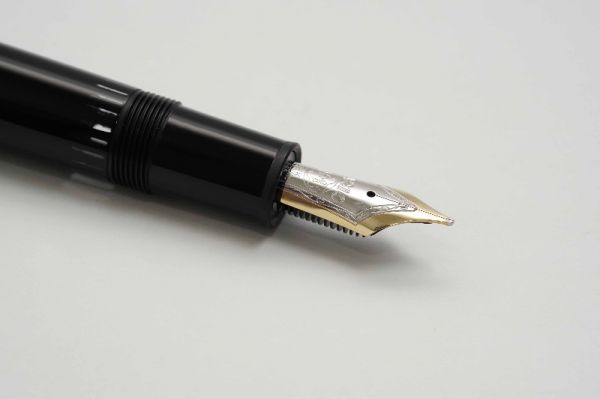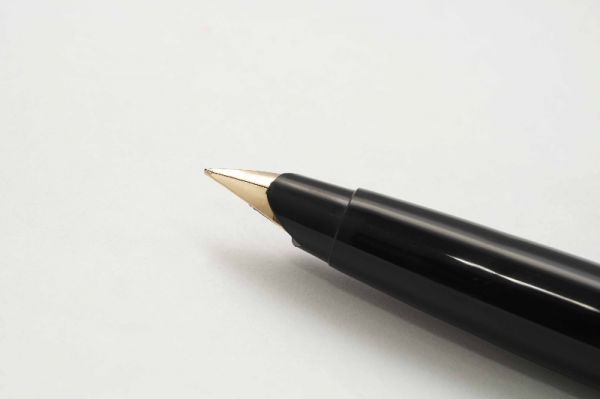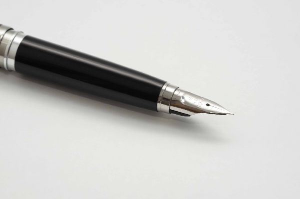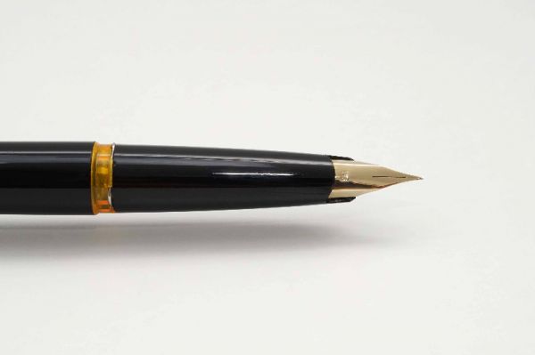 Bút máy Sheaffer PFM III Black là model PFM thuộc thế hệ thứ III và là dòng bút có độ thẩm mỹ cao với kích thước fullsize và cầm rất vừa tay khi sử dụng. Thân bút làm bằng hỗn hợp nhựa cứng màu đen bóng. Nắp bút đậy khá êm tay nhờ vòng đệm có 3 ngạnh ở section, viền nắp có khắc dòng chữ Sheaffer – Made in USA, thanh cài bằng thép mạ vàng tạo dáng cong tinh tế, đầu cài có chấm white-dot đặc trưng. Ngòi bút chế tác từ vàng 14K có tiết diện khá lớn được khảm liền lạc với section, ngòi bút cỡ F cho ra nét chữ êm và trơn mượt khi viết hoặc ký. Bút bơm mực bằng cơ chế “snorkel touchdown”, vặn và kéo phần đuôi bút để cây kim bên trong feed thò ra trước khi bơm, sau đó cho đầu kim vào lọ mực và ấn nhanh đuôi bút để tạo lực hút và chờ 10 giây để mực bơm đầy vào trong, bút chứa được khá nhiều mực cho một lần bơm. Tổng thể bút là hàng đã qua sử dụng, ở tình trạng 95% (vỏ nhựa bị xước răm nhẹ, 2 bên mép cài bị phai lớp mạ), bút không kèm hộp và đang hoạt động tốt.