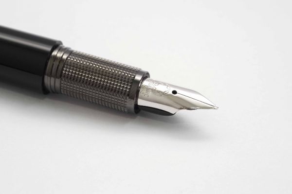 Bút máy Montblanc Meisterstuck 149 Classic Black Resin thuộc phân khúc cao cấp và là cây bút flagship của dòng Meisterstuck. Bút có hình dáng điếu xì gà kinh điển với kích thước oversize nên cầm rất vừa tay khi sử dụng. Phần thân và nắp bút được gia công từ hỗn hợp nhựa resin cao cấp màu đen bóng sang trọng. Nắp bút đậy bằng ren vặn, vòng ring nắp cũng bằng hợp kim mạ vàng có khắc dòng chữ Montblanc Meisterstuck. Đỉnh nắp trang trí logo hoa tuyết nhỏ màu trắng. Cài bút bằng hợp kim mạ vàng 18K, dãy series nhỏ trên vòng ring cài được khắc rõ nét. Thân bút thiết kế to, tích hợp làm nơi chứa mực, bút chứa được nhiều mực cho một lần bơm. Cửa sổ mực ở thân bút trang trí bằng các sọc nhựa màu trong suốt để quan sát lượng mực bên trong. Ngòi bút chế tác từ vàng 14K 585 dạng two-tone có độ hoàn thiện cao, phần lá ngòi có diện tích lớn nên chiếm trọn ánh nhìn, lưng ngòi khắc logo Montblanc và nhiều hoa văn chạm khắc tinh xảo, ngòi bút cỡ F cho ra nét chữ êm và trơn mượt khi viết hoặc ký. Bút bơm mực bằng cơ chế piston filler, vặn đuôi để bơm mực, phần thân và đuôi bút tích hợp thành bộ phận bơm và chứa mực.