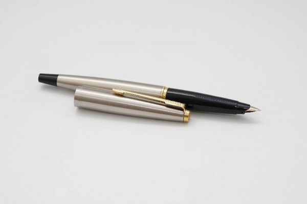 Phiên bản bút máy Parker 45 Black & Stainless Steel Cap là một trong nhiều model cơ bản của series Parker 45. Ngoại hình của bút thon gọn và nhẹ hơn các phiên bản Parker 51 và 21. Thân bút được làm từ hỗn hợp nhựa cứng màu đen bóng sang trọng. Nắp bút hoàn thiện từ hợp kim thép dạng brush steel, viền nắp có khắc logo Parker và dòng chữ Made in USA. Cài bút bằng kim loại mạ vàng gia công theo hình dáng mũi tên Parker. Đỉnh nắp và đuôi bút tạo dáng thuôn 2 hai đầu và vát bằng thay vì bo tròng như Parker 51. Cụm ngòi của Parker 45 dạng bán hở khá đặc thù vì có thể tháo cả cụm ngòi ra vệ sinh hoặc thay thế ngòi khi bị hư hỏng. Ngòi bút bằng vàng 14K có kiểu dáng thanh mảnh, ngòi cỡ F cho ra nét chữ trơn mượt khi viết. Bút bơm mực bằng piston cao su đi kèm. Tổng thể bút là hàng đã qua sử dụng, ở tình trạng 99%, bút không kèm hộp và đang hoạt động tốt.