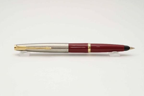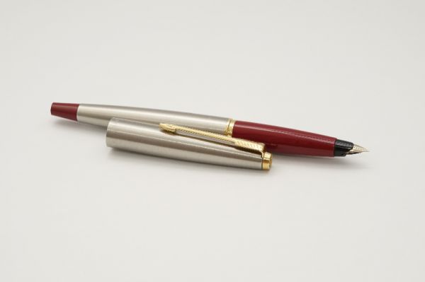 Phiên bản bút máy Parker 45 Stainless Steel là một trong nhiều model cơ bản của series Parker 45. Ngoại hình của bút thon gọn và nhẹ hơn các phiên bản Parker 51 và 21. Thân và nắp bút được hoàn thiện từ hợp kim thép dạng brush steel, viền nắp có khắc logo Parker và dòng chữ Made in USA. Cài bút bằng kim loại mạ vàng gia công theo hình dáng mũi tên Parker. Đỉnh nắp và đuôi bút tạo dáng thuôn 2 hai đầu và vát bằng thay vì bo tròng như Parker 51. Phần section và đuôi bút phối nhựa cứng màu đỏ khá đẹp. Cụm ngòi của Parker 45 dạng bán hở khá đặc thù vì có thể tháo cả cụm ngòi ra vệ sinh hoặc thay thế ngòi khi bị hư hỏng. Ngòi bút bằng vàng 10K có kiểu dáng thanh mảnh, ngòi cỡ EF cho ra nét chữ trơn mượt khi viết. Bút bơm mực bằng piston cao su đi kèm.