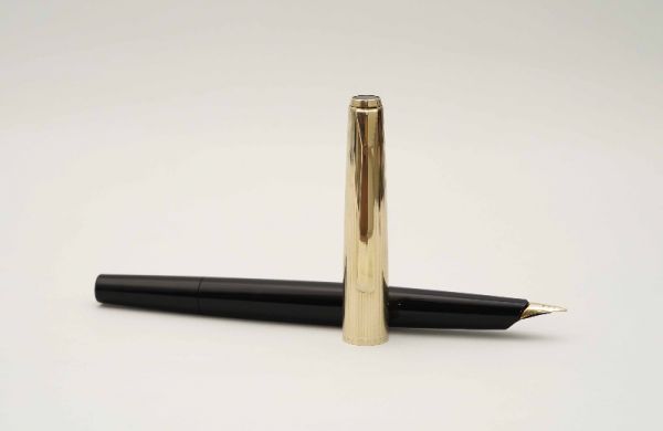 Parker 61 Grey & 12K Gold Filled Cap là model khá đặc trưng và tiêu biểu của Parker giai đoạn những năm 1950-1960. Bút có ngoại hình tương tự như Parker 51 nhưng kiểu dáng nhỏ gọn hơn, đặc điểm dễ nhận dạng của Parker 61 là biểu tượng mũi tên được dát lên phần nhựa section gần ngòi bút. Thân bút bằng hỗn hợp nhựa cứng màu xám. Nắp bút bằng hợp kim bọc vàng 12K rất đẹp, thân nắp trang trí nhiều đường line kẻ sọc, viền nắp khắc logo Parker 61 và ký hiệu 1/10 12K Gold Filled Made in U.S.A, bút đậy nắp êm tay nhờ cơ chế đệm bên trong. Đỉnh nắp và đuôi bút đính hạt nhựa jewel màu xám. Cài bút bằng kim loại mạ vàng, gia công theo hình dáng mũi tên Parker truyền thống. Cụm ngòi là thiết kế đặc trưng của Parker 61 nói riêng và Parker series nói chung với ngòi và feed ẩn bên trong scetion, phần feed có nhiều lá điều tiết mực và là cầu nối với ống mao dẫn, cơ cấu khép kín này giúp bơm mực và điều tiết dòng mực nhanh để cho ra nét chữ liền mạch, cũng như tiết kiệm mực đáng kể so với kiểu ngòi và feed hở thông thường. Ngòi bút bằng vàng 14K nét F cho ra nét chữ êm và trơn mượt khi viết. Bút bơm mực bằng cơ chế capillary filling system, cho phần đuôi ống kim loại “teflon” vào lọ mực và chờ khoảng 30 giây cho hệ thống mao dẫn hút đầy mực vào trong lõi trữ mực. Ưu điểm của cơ chế bơm này là giúp đầu ngòi không bị dính mực mà chỉ cần lau mực ở đuôi ống kim loại sau khi bơm.