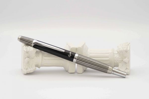 Bút máy Aurora Ipsilon Sterling Silver không chỉ đạt độ hoàn thiện cao về mặt thẩm mỹ mà còn phát huy tối đa công năng sử dụng, bút có kích thước mid-size và mang kiểu dáng hình thoi kinh điển. Điểm nhấn nổi bật là thân và nắp bút gia công từ chất liệu bạc khối, vỏ bút trang trí các đường line guilloche tinh tế. Nắp bút đậy êm và chắc tay, khi đậy tạo ra tiếng “tách” khá thanh, viền nắp phối hai vòng ring bằng nhựa màu đen có in chữ Aurora Italy. Cài bút bằng kim loại mạ bạch kim, tạo hình chữ “Y” cách điệu uyển chuyển. Đỉnh nắp và đuôi bút được trang trí hai chóp nhựa màu đen. Thân có chiều dài hợp lý nên tạo cảm giác khá cân bằng và đầm tay. Cụm section bằng hỗn hợp nhựa resin màu đen bóng. Ngòi bút được chế tác từ vàng 14K mạ chrome có độ hoàn thiện cao, lưng ngòi chạm khắc nhiều hoa văn tinh xảo, ngòi bút cỡ M cho ra nét chữ êm và trơn mượt khi viết hoặc ký. Bút bơm mực bằng converter cao cấp đi kèm.