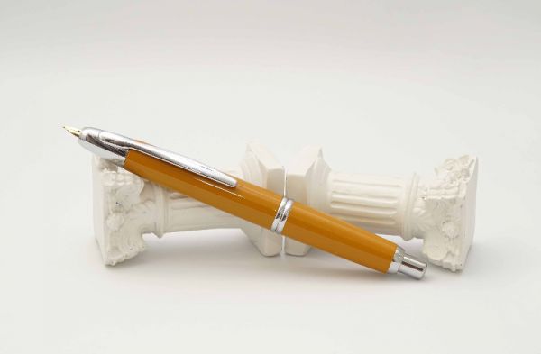 Phiên bản bút máy Pilot Custom 823 Amber là một trong những model đẹp nhất của series Custom 823 với màu sắc sang trọng bắt mắt tựa như món trang sức làm từ hổ phách. Ngoại hình bút vẫn trung thành với hình dáng điếu xì gà và có kích thước fullsize nên phù hợp với đại đa số người dùng. Vỏ bút gia công từ hỗn hợp nhựa cao cấp màu hổ phách trong suốt rất đẹp và có thể quan sát được cơ chế hoạt động của bút. Thân bút khá dài tạo cảm giác thoải mái khi cầm trên tay. Nắp bút đậy kiểu ren vặn, vòng cap band bằng kim loại mạ vàng có khắc chữ Pilot Custom 823 và 6 ngôi sao nhỏ rất chi tiết. Cài bút bằng hợp kim mạ vàng, đuôi cài kết thúc bằng chấm kim loại tròn đặc trưng. Đỉnh nắp và đuôi bút kết thúc bằng 2 chóp nhựa màu đen và tạo điểm nhấn với vòng ring mạ vàng. Ngòi bút chế tác từ vàng 14K 585 với lá ngòi có kích thước khá lớn, lưng ngòi chạm khắc nhiều hoa văn sắc nét, ngòi bút cỡ B cho ra nét chữ trơn mượt khi ký. Bút bơm mực bằng cơ chế Vacuum Filler, vặn và kéo phần đuôi bút trước khi bơm, sau đó cho ngòi vào lọ mực và ấn nhanh đuôi bút để tạo lực hút và chờ 10 giây để mực bơm đầy vào trong, bút chứa khá nhiều mực cho một lần bơm.