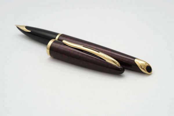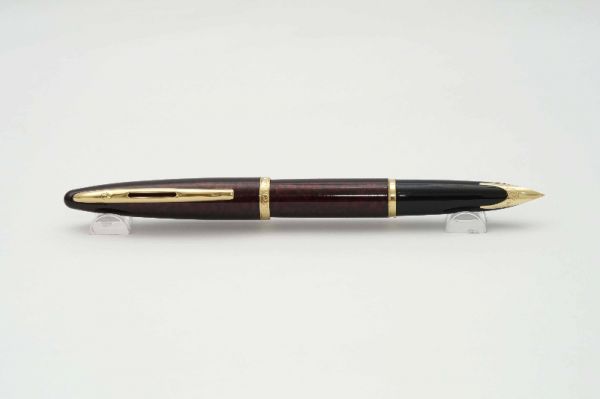 Phiên bản bút máy Waterman Carene Marine Amber là model đương đại ra mắt vào năm 1998 và được lấy cảm hứng từ hình dáng chiếc du thuyền sang trọng. Bút có kích thước midsize nên cầm rất vừa tay khi sử dụng. Thân và nắp bút bằng hợp kim phủ lacquer vân đá màu hổ phách rất đẹp. Nắp bút đậy êm và chắc tay, viền nắp có khắc chìm chữ Waterman. Cài bút bằng hợp kim mạ palladium gia công tạo hình gợn sóng uốn lượn tinh tế, đỉnh cài có đóng chìm logo W. Cụm ngòi là điểm nhấn chính của dòng Carene với lá ngòi kiểu inlaid được khảm liền lạc với cụm section, ngòi bút chế tác từ vàng 18K mạ rhodium rất tỉ mỉ, lưng ngòi khắc logo Wateraman và ký hiệu vàng 750, ngòi bút cỡ F cho ra nét chữ trơn mượt khi viết. Bút bơm mực bằng converter Waterman đi kèm.