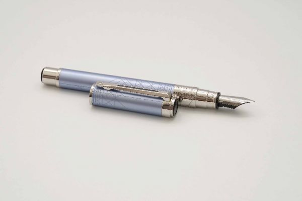 Bút máy Waterman Perspective Decoration Blue là model tiêu biểu và đặc sắc của dòng Perspective, mang đến vẻ đẹp khó cưỡng trong từng chi tiết tinh xảo. Bút có kích thước midsize và trọng lượng khá đầm. Phần thân và nắp bút bằng hợp kim đồng thau, bề mặt vỏ bút được hoàn thiện bởi lớp sơn mài màu xanh lam rất đẹp, xen kẽ là các đường phối cảnh hình học mô phỏng sự thuần khiết của kiến trúc hiện đại, đó là các góc độ và tỷ lệ hoàn hảo của các tòa nhà đô thị nổi tiếng. Nắp khi đậy tạo tiếng “tách” khá thanh, cài bút bằng kim loại mạ chrome được tạo dáng góc cạnh rất tinh tế, đỉnh nắp và đuôi cài có trang trí logo Waterman. Thân bút có chiều dài và kích thước hợp lý nên tạo cảm giác thoải mái khi sử dụng. Cụm section được mạ chrome trắng sáng tạo sự liền mạch với ngòi bút, bề mặt section có khắc chữ Waterman Paris rất chi tiết. Ngòi bút hoàn thiện từ hợp kim thép cao cấp, lưng ngòi trang trí các đường đồ hoạ cách điệu cùng logo Waterman, ngòi bút cỡ F cho ra nét chữ trơn mượt khi viết hoặc ký. Bút bơm mực bằng converter Waterman đi kèm.