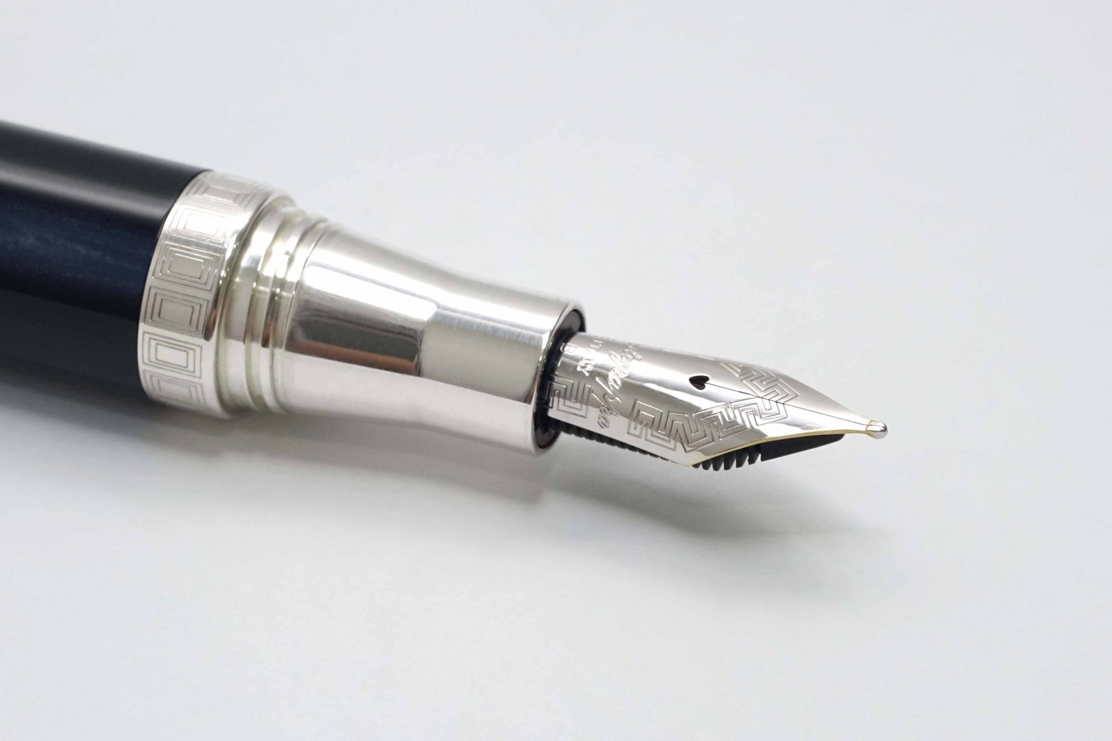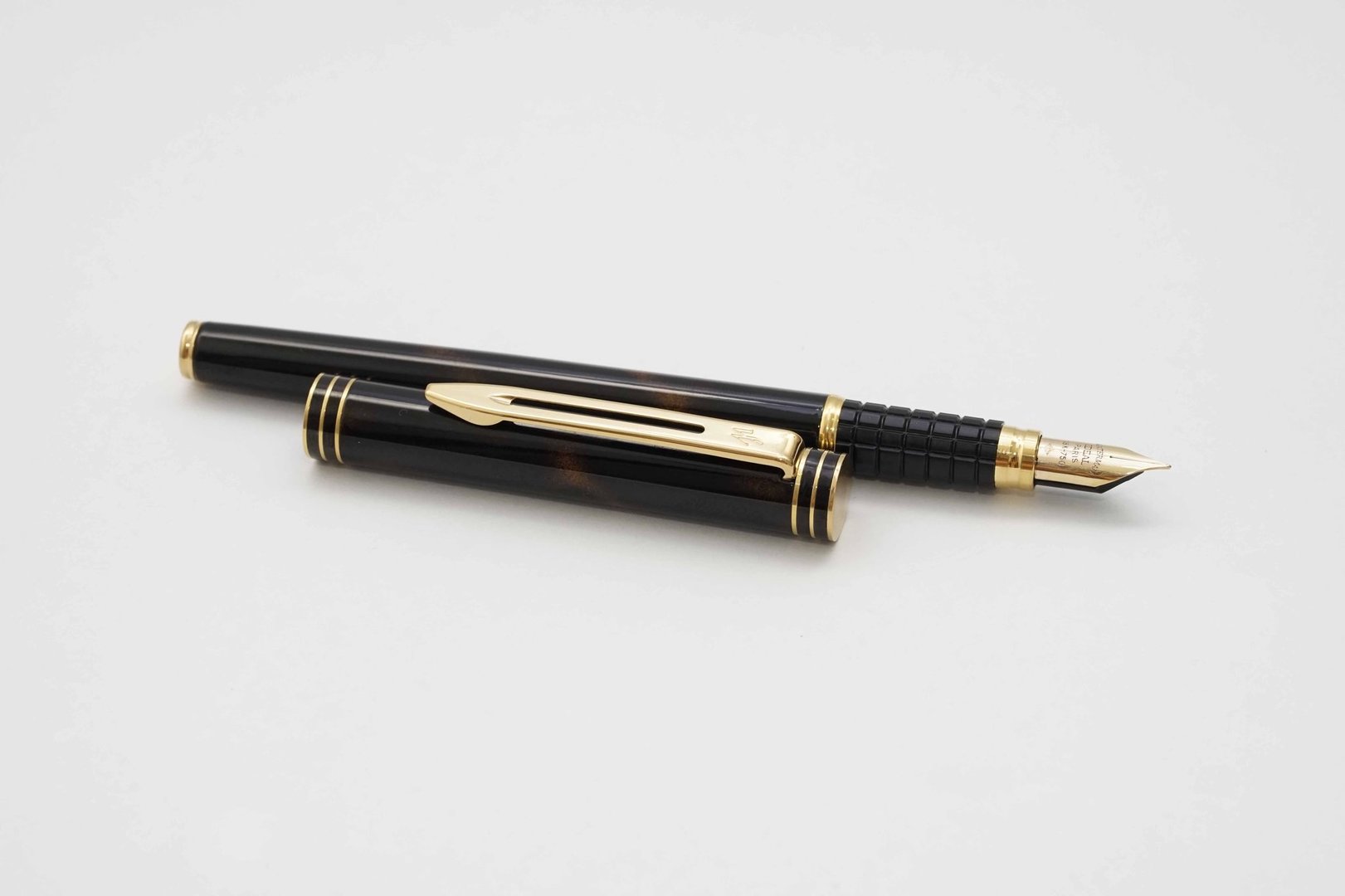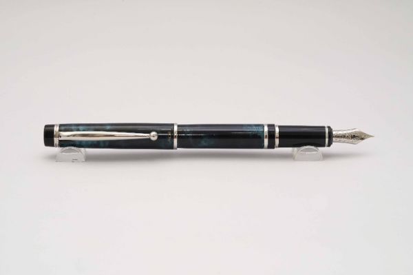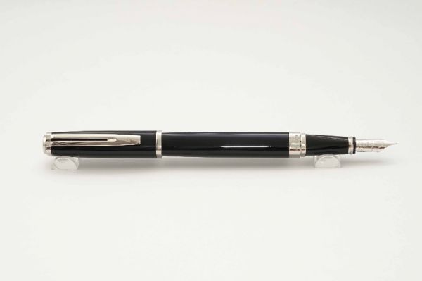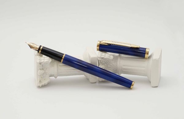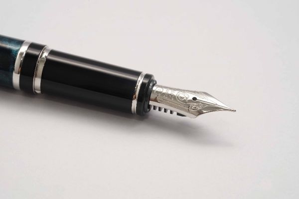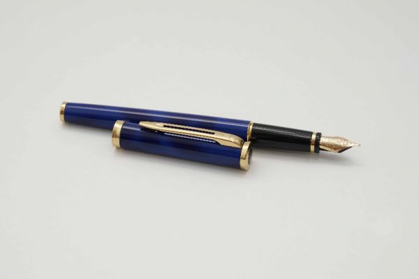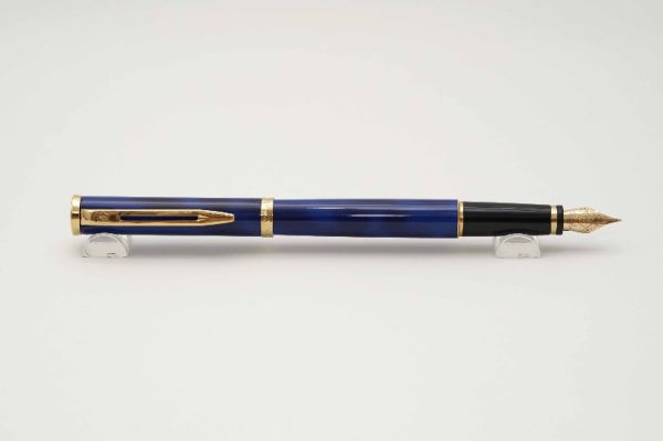 Bút máy Waterman Preface Blue Marble thuộc series “Preface” tầm trung của Waterman được tung ra thị trường giai đoạn những năm 1990s. Bút có thiết kế khá đẹp và thẩm mỹ với kích thước tiêu chuẩn nên phù hợp với đại đa số người dùng. Thân và nắp bút bằng hợp kim đồng sơn phủ lacquer màu xanh vân đá rất đẹp và sang trọng. Nắp bút đậy êm và chắc tay, vòng cap band viền nắp mạ vàng có khắc dòng chữ Waterman Made in France. Đỉnh nắp trang trí biểu tượng lục giác của Waterman. Cài bút bằng kim loại mạ vàng, tạo dáng góc cạnh tinh tế, đầu cài có đóng chìm ký hiệu W. Thân bút có chiều dài hợp lý nên khá cân đối khi sử dụng. Ngòi bút chế tác từ vàng 18K có độ hoàn thiện cao, lưng ngòi chạm khắc logo Waterman cùng nhiều hoa văn rất tinh xảo, ngòi bút cỡ M cho ra nét chữ êm và trơn mượt khi viết hoặc ký. Bút sử dụng ống mực loại tiêu chuẩn hoặc converter Waterman.