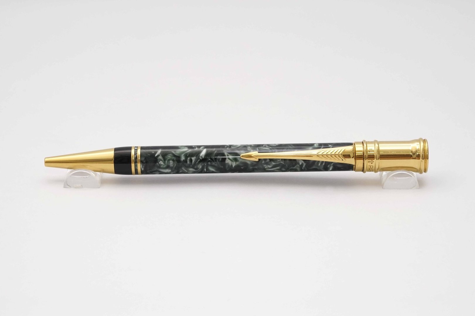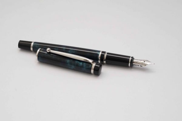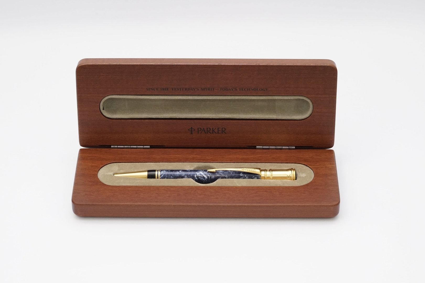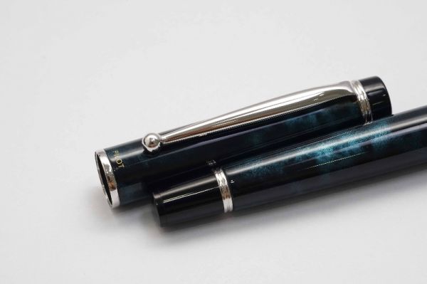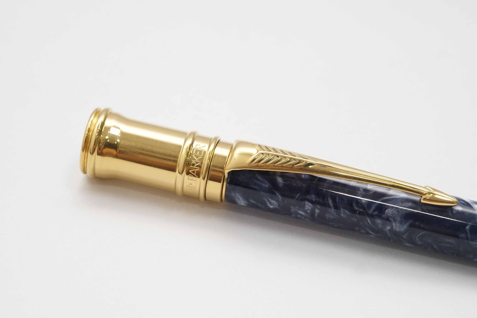 Bút máy Parker Duofold Centennial Blue Marble là phiên bản ra mắt vào năm 1987, đây là model tiêu biểu gắn liền với chiều dài lịch sử của dòng Duofold và cho đến ngày nay vẫn luôn giữ được sức hấp dẫn vượt thời gian. Bút có kích thước midsize và cầm khá đầm tay khi sử dụng. Vỏ bút gia công từ hỗn hợp nhựa resin cao cấp màu xanh vân đá cẩm thạch rất đẹp và có chiều sâu. Nắp bút đậy dạng ren vặn, cài bút bằng hợp kim mạ vàng 23K gia công theo hình dáng mũi tên Parker đặc trưng. Bút thuộc thế hệ first generation “Centennial Edition” nên đỉnh nắp không đính logo át bích như các dòng Duofold sau này. Ngòi bút bằng vàng 18K nét F dạng duo-tone, lưng ngòi trang trí hoa văn mũi tên và ký hiệu vàng 18K 750, ngòi bút được kiểm tra tỉ mỉ qua nhiều công đoạn để đảm bảo mang lại trải nghiệm viết tuyệt vời. Bút bơm mực bằng converter Parker đi kèm.