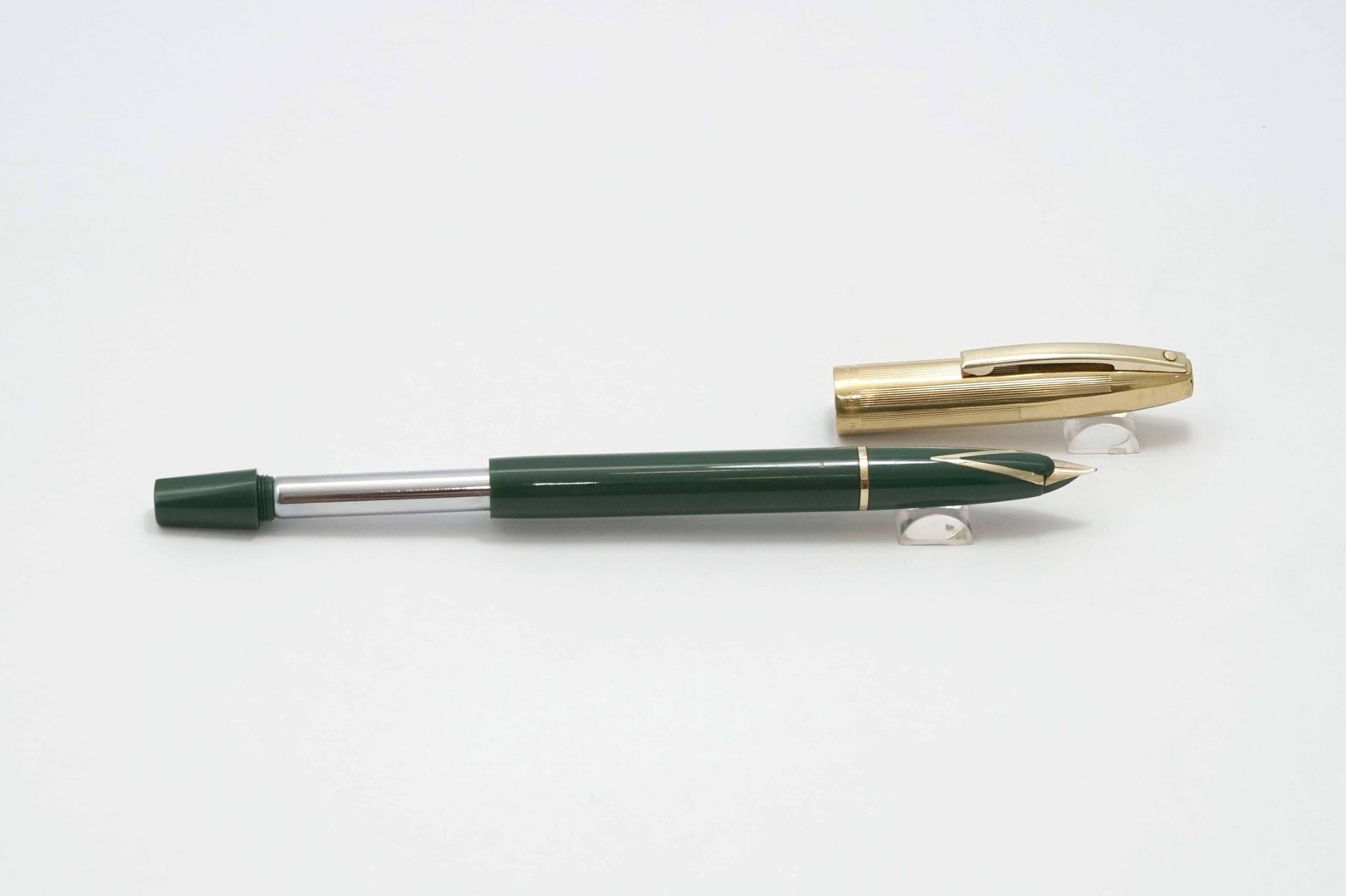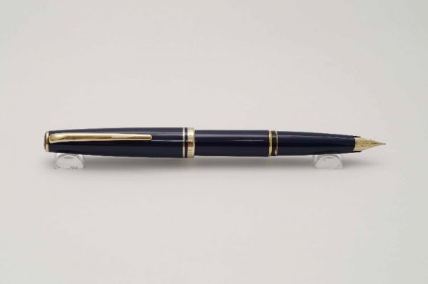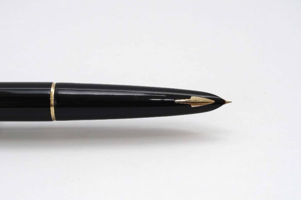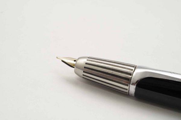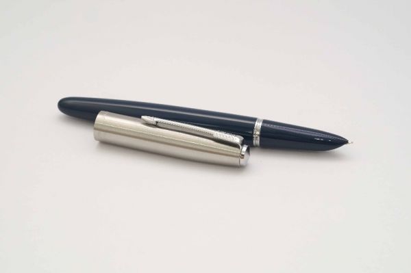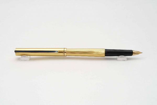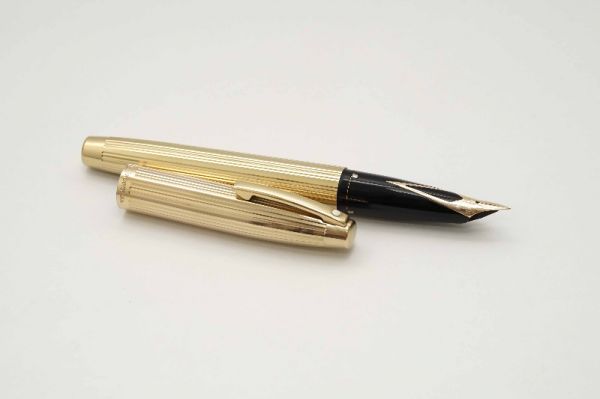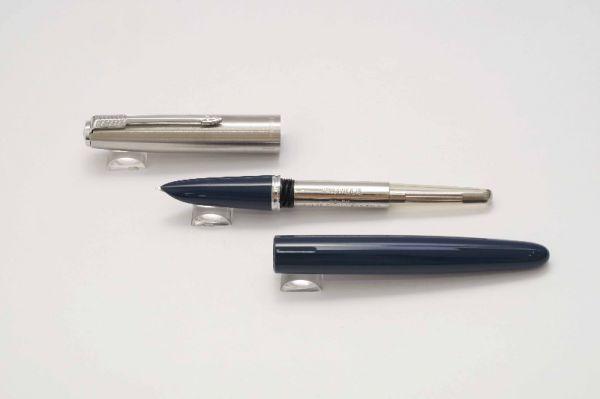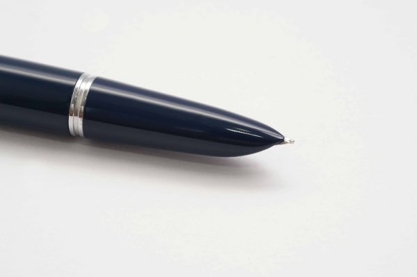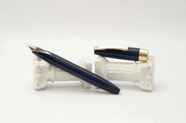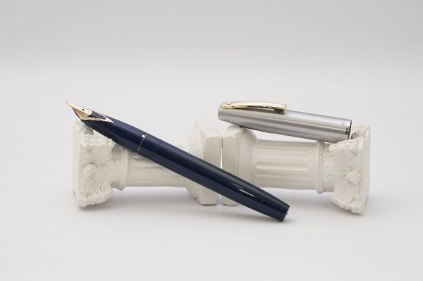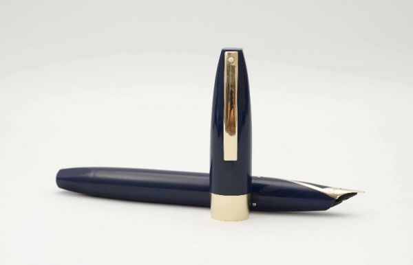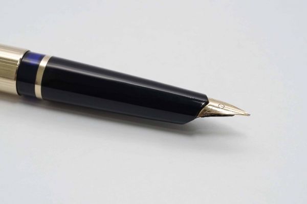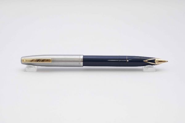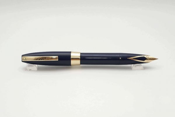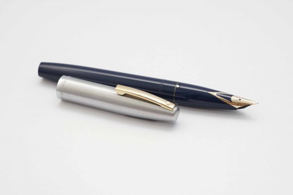 Bút máy Sheaffer Imperial Triumph 440 Blue Barrel được sản xuất trong những năm 1970s, bút có thiết kế khá đẹp với kích thước tiêu chuẩn nên phù hợp với mọi người dùng. Thân bút bằng hỗn hợp nhựa cao cấp màu xanh đậm. Nắp bút gia công từ hợp kim thép dạng brush steel, viền nắp có khắc dòng chữ Sheaffer – Made in USA. Thanh cài bằng kim loại mạ vàng, tạo dáng cong rất thẩm mỹ, đầu cài có chấm white dot đặc trưng của Sheaffer. Thân bút có chiều dài cân đối nên cầm rất thoải mái. Ngòi bút là điểm nhấn cho toàn bộ cây bút với lá ngòi kiểu inlaid được khảm liền lạc với section, ngòi bút chế tác từ vàng 14K, lưng ngòi có khắc ký hiệu Sheaffer 14K 585 USA, ngòi bút cỡ F cho ra nét chữ trơn mượt khi viết. Bút bơm mực bằng piston cao su đi kèm.