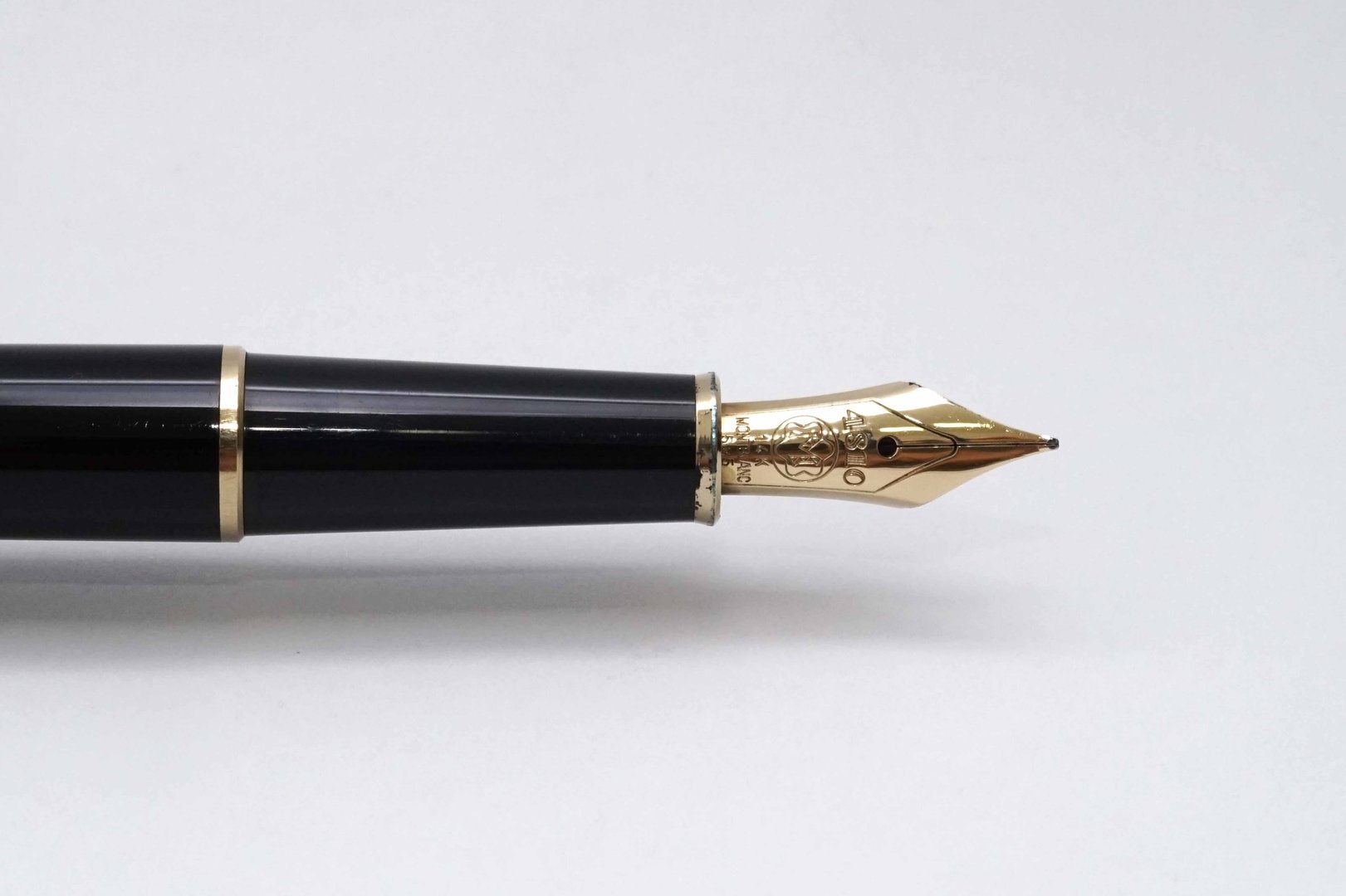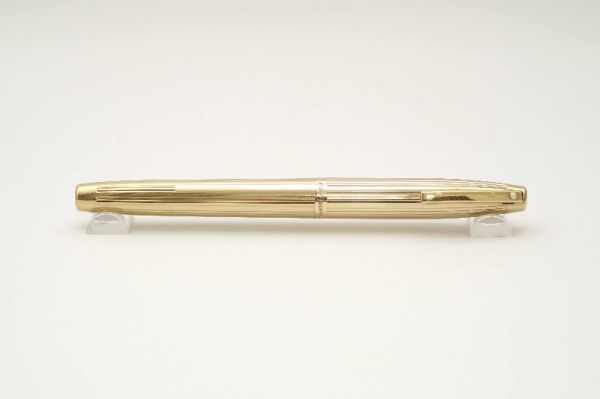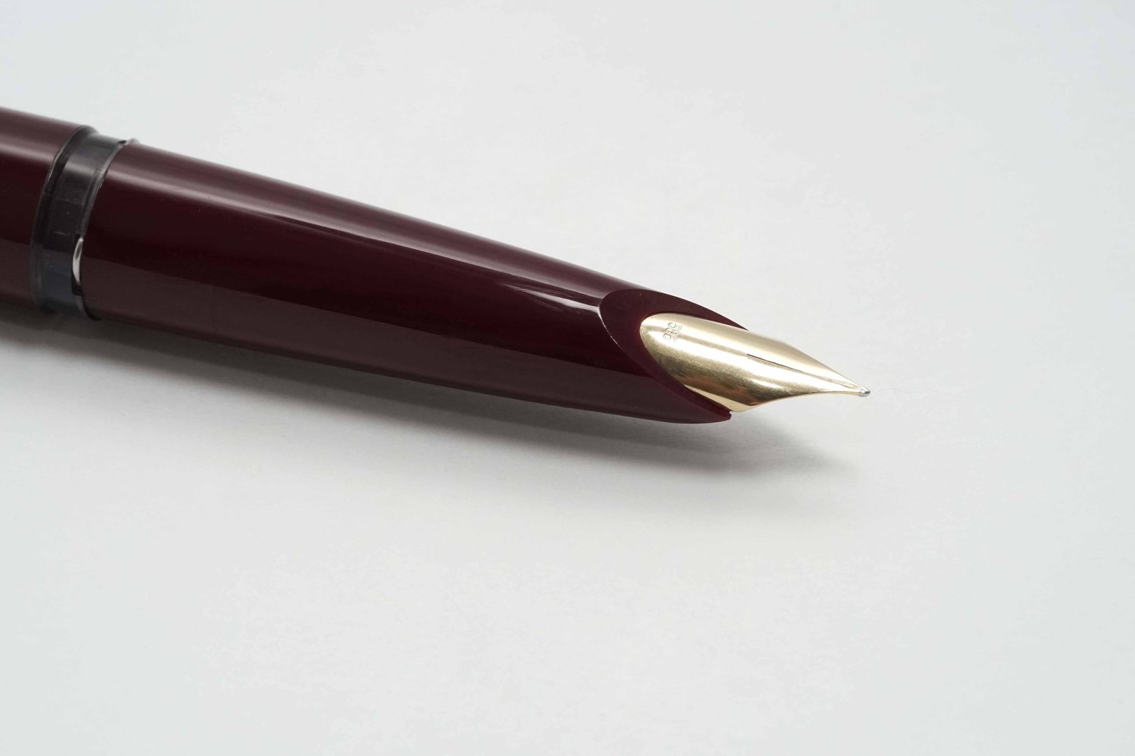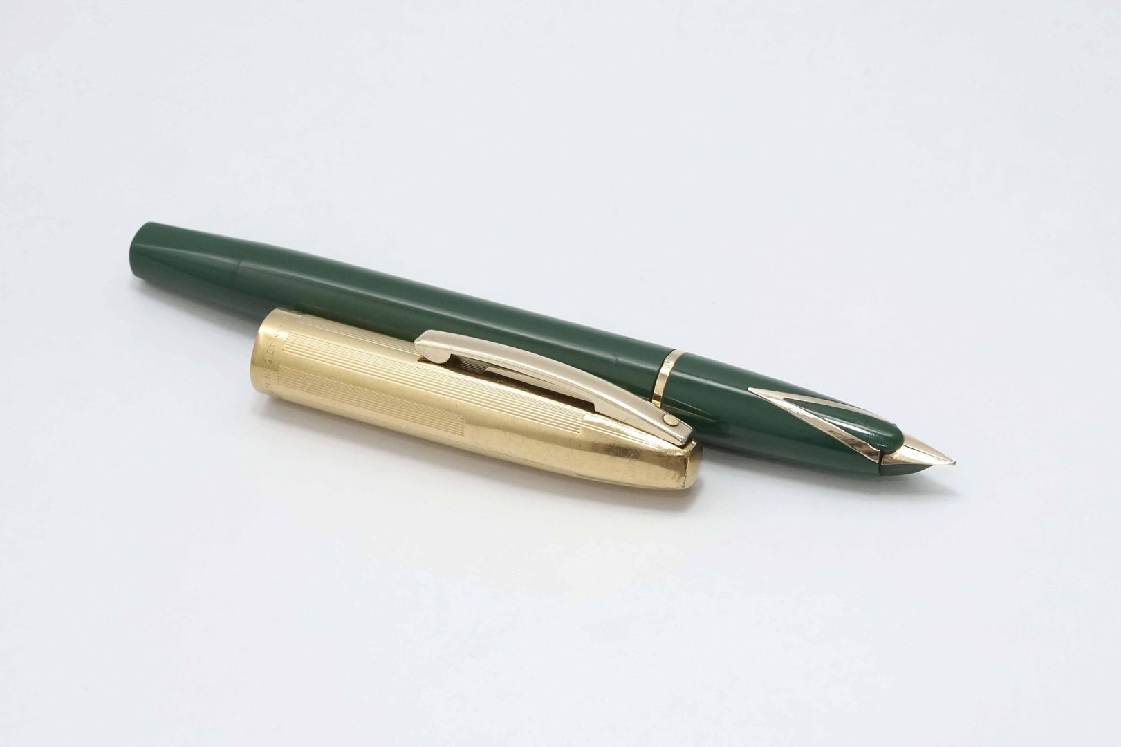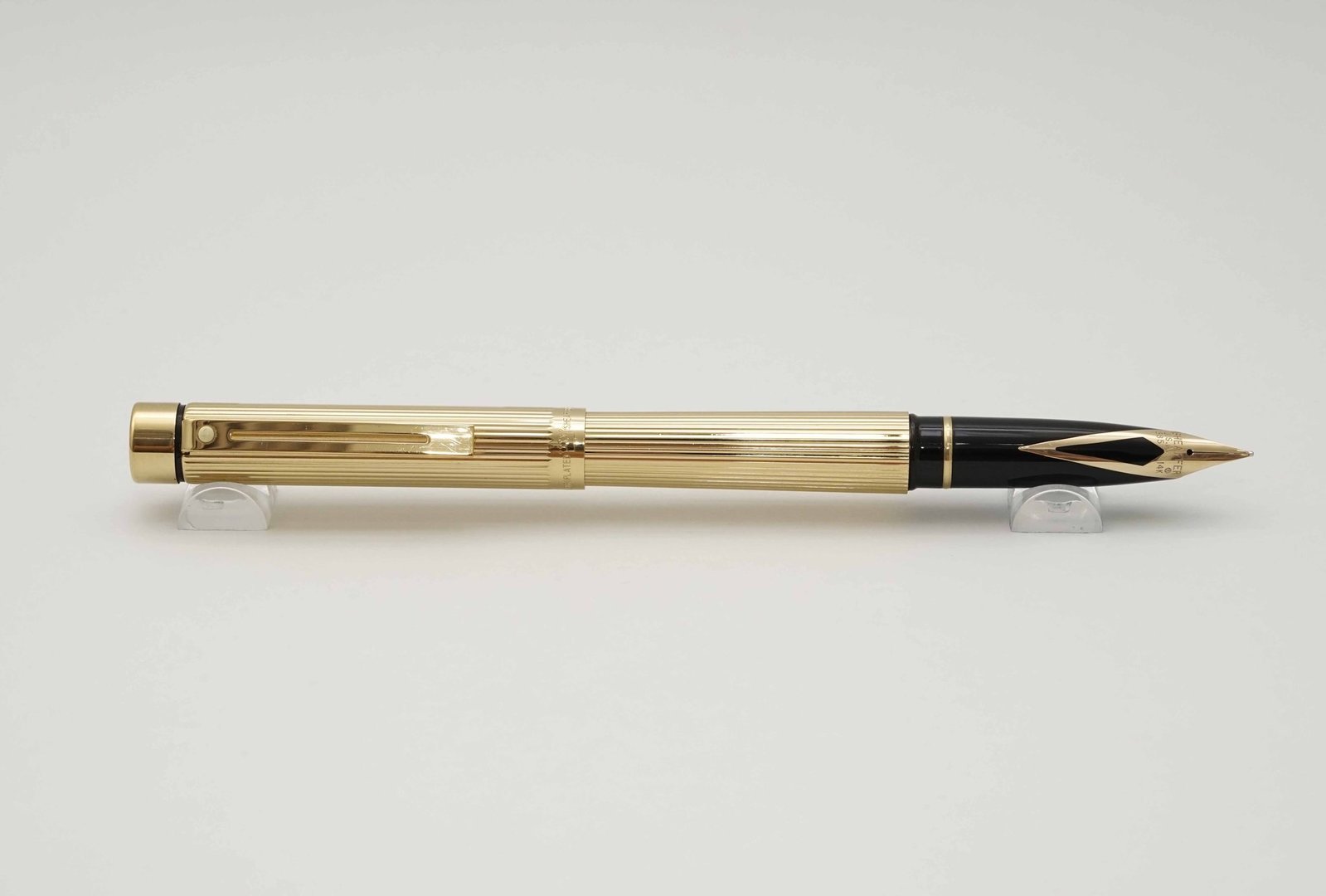 Bút máy Sheaffer Imperial Triumph 440 Blue Barrel được sản xuất trong những năm 1970s, bút có thiết kế khá đẹp với kích thước tiêu chuẩn nên phù hợp với mọi người dùng. Thân bút bằng hỗn hợp nhựa cao cấp màu xanh đậm. Nắp bút gia công từ hợp kim thép dạng brush steel, viền nắp có khắc dòng chữ Sheaffer – Made in USA. Thanh cài bằng kim loại mạ vàng, tạo dáng cong rất thẩm mỹ, đầu cài có chấm white dot đặc trưng của Sheaffer. Thân bút có chiều dài cân đối nên cầm rất thoải mái. Ngòi bút là điểm nhấn cho toàn bộ cây bút với lá ngòi kiểu inlaid được khảm liền lạc với section, ngòi bút chế tác từ vàng 14K, lưng ngòi có khắc ký hiệu Sheaffer 14K 585 USA, ngòi bút cỡ F cho ra nét chữ trơn mượt khi viết. Bút bơm mực bằng piston cao su đi kèm.