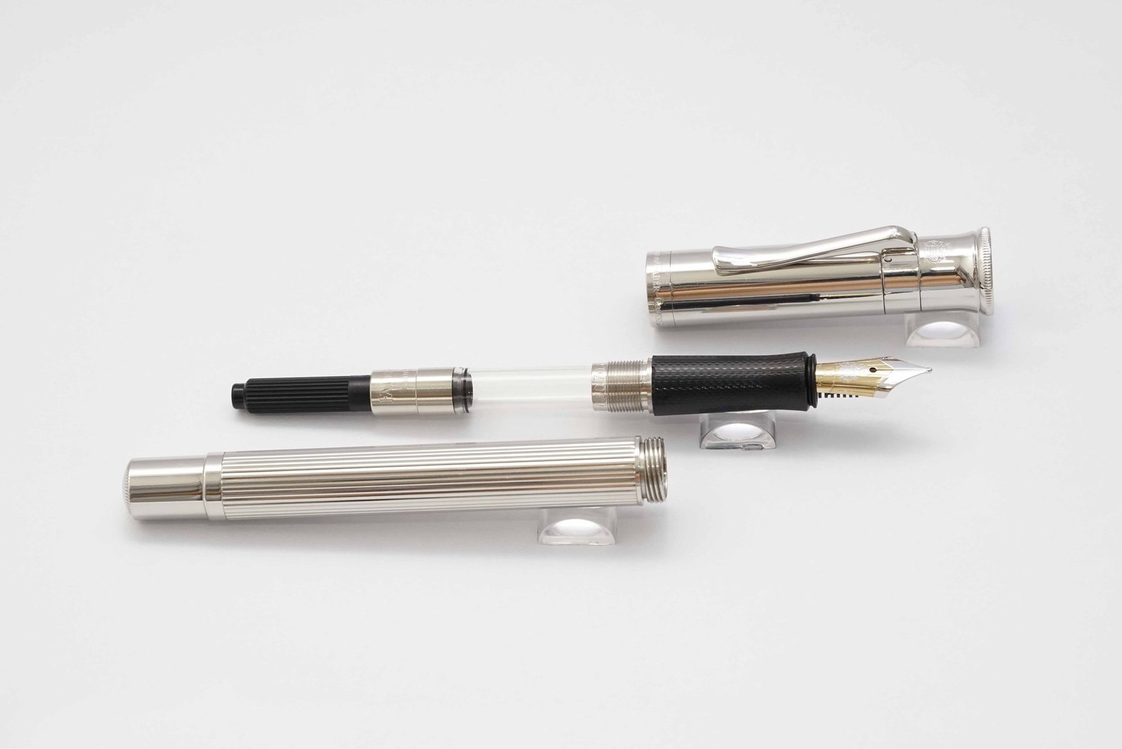 Phiên bản bút máy Graf von Faber-Castell Guilloche Viper Green mang phong cách sang trọng với thiết kế có tính thẩm mỹ cao cũng như phát huy tối đa công năng sử dụng. Mỗi chi tiết trên thân bút đều được trau chuốt tỉ mỉ. Thân bút gia công từ hỗn hợp nhựa resin cao cấp màu xanh lá, bề mặt thân bút được tạo điểm nhấn với các đường hoạ tiết guilloches dạng vẩy rắn, đây là những hoa văn chạm khắc tinh xảo dùng để trang trí bề mặt đồng hồ và các món trang sức đắt tiền. Nắp bút đậy kiểu ren vặn và được làm từ hợp kim liền khối tạo cảm giác liền lạc, phần đỉnh nắp bút uốn cong xoè ra ngoài để tạo điểm nhấn, viền nắp có khắc dòng chữ Graf Von Faber-Castell. Thanh cài khá đặc trưng của dòng Graf Von với dáng cong uyển chuyển, cài bút có độ nẫy tốt nhờ cơ cấu đàn hồi phức tạp bên trong nắp. Ngòi bút chế tác từ vàng 18K dạng twotone có độ hoàn thiện cao, lưng ngòi khắc logo Faber-Castell cùng nhiều hoa văn sắc nét, ngòi bút cỡ F cho ra nét chữ trơn mượt khi viết. Bút sử dụng converter cao cấp đi kèm.