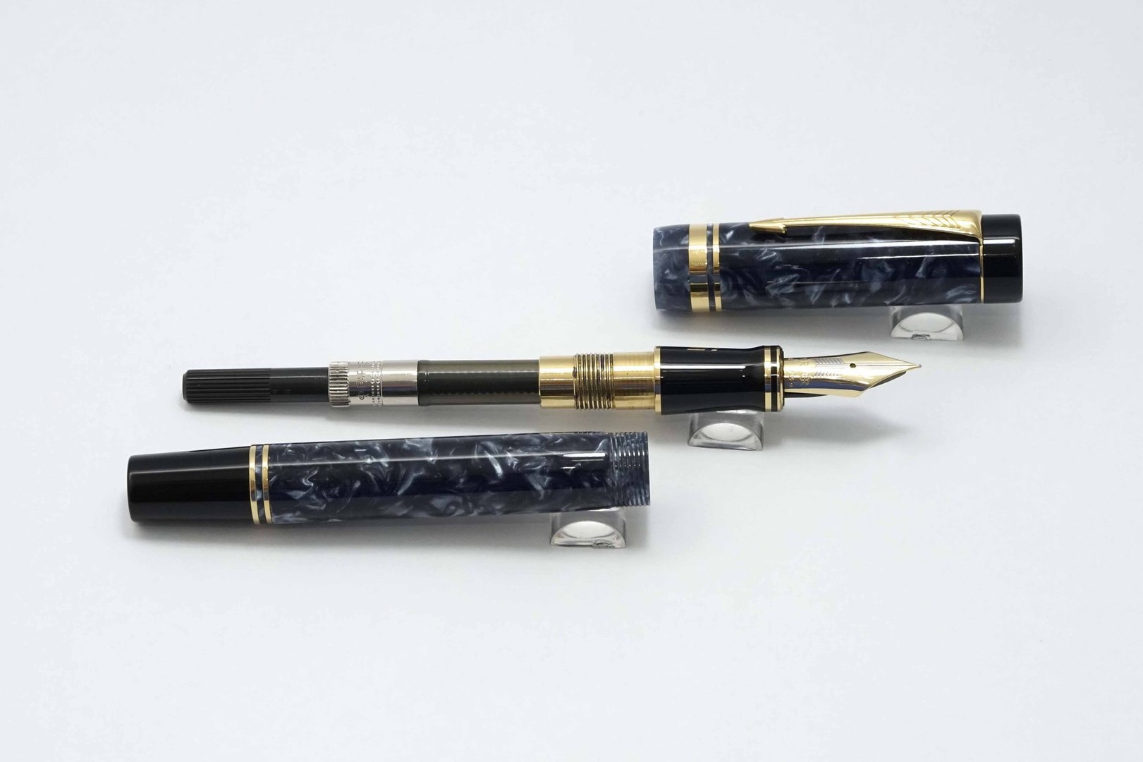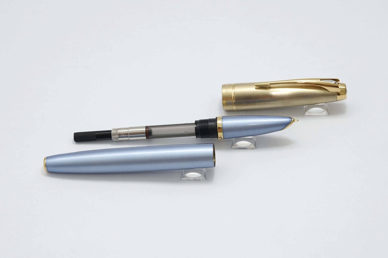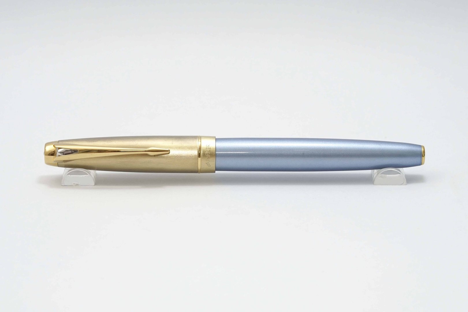 Bút máy Parker 51 Tea Blue & Rolled Gold Cap là phiên khá bản đẹp và tiêu biểu của series Parker 51, bút có kích thước tiêu chuẩn nên phù hợp mọi cỡ tay người dùng. Thân bút bằng hỗn hợp nhựa cứng màu xanh tea blue bắt mắt. Nắp bút bằng hợp kim bọc vàng 12K rất dày và đậy êm tay nhờ bộ đệm bên trong, đỉnh nắp trang trí hạt jewell bằng nhựa màu đen, viền nắp khắc logo Parker và dòng chữ Made in USA 1/10 12K Gold Filled. Thanh cài bằng hợp kim bọc vàng được tạo hình mũi tên Parker truyền thống. Điểm khác biệt và dễ nhận diện giữa Parker 51 so với các dòng Parker khác là cụm ngòi và feed nằm ẩn bên trong section, phần feed có nhiều lá điều tiết mực và là cầu nối với ống dẫn nằm bên trong piston, cơ cấu khép kín này giúp bơm và điều tiết dòng mực rất nhanh để cho ra nét chữ liền mạch, ngòi không bị khô mực và sẵn sàng viết bất kỳ lúc nào so với kiểu ngòi hở thông thường. Ngòi bút bằng vàng 14K nét M cho ra nét chữ êm mượt khi viết. Bút bơm mực bằng cơ chế Aerometric filling system với piston cao su zin đi kèm.